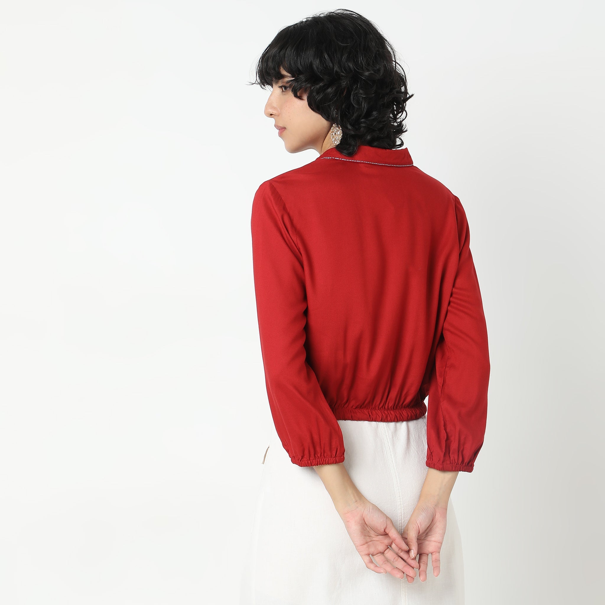 This solid pattern crop top has a shirt collar and three-fourth sleeve. Made from rayon, it is soft and comfortable to wear.