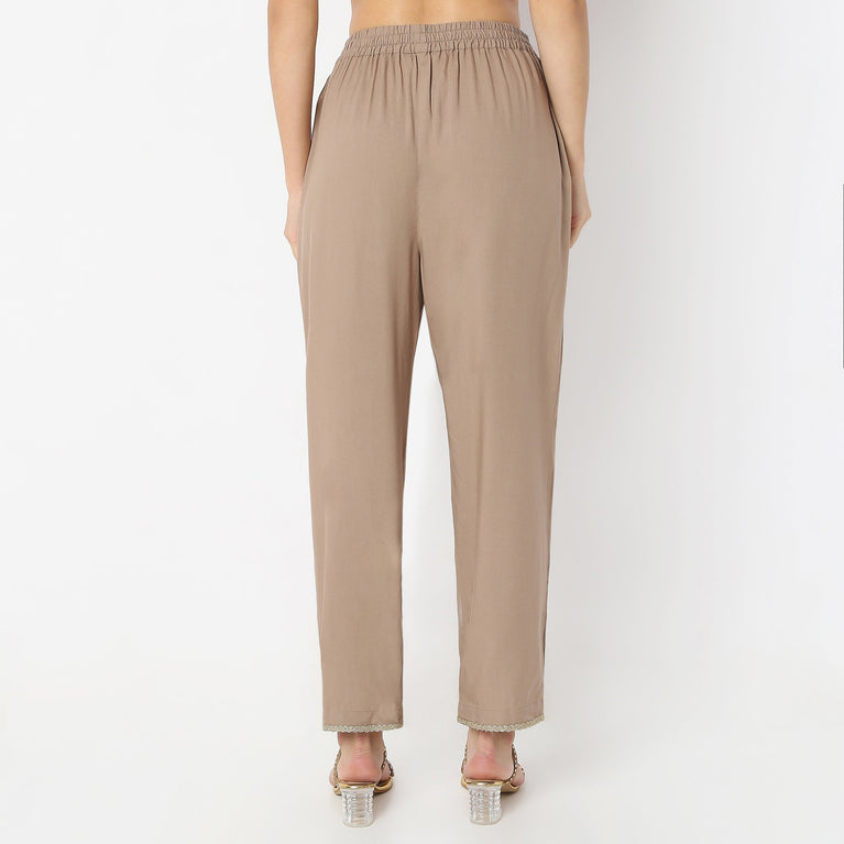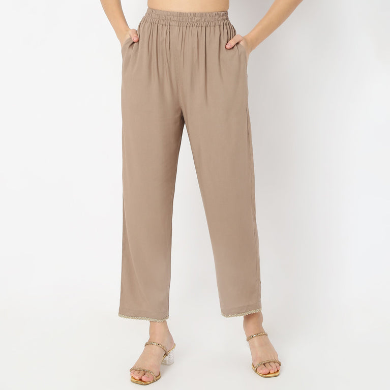 These solid pattern regular fit trousers has ankle length, high rise waist. Made from polyester, it is soft and comfortable to wear.