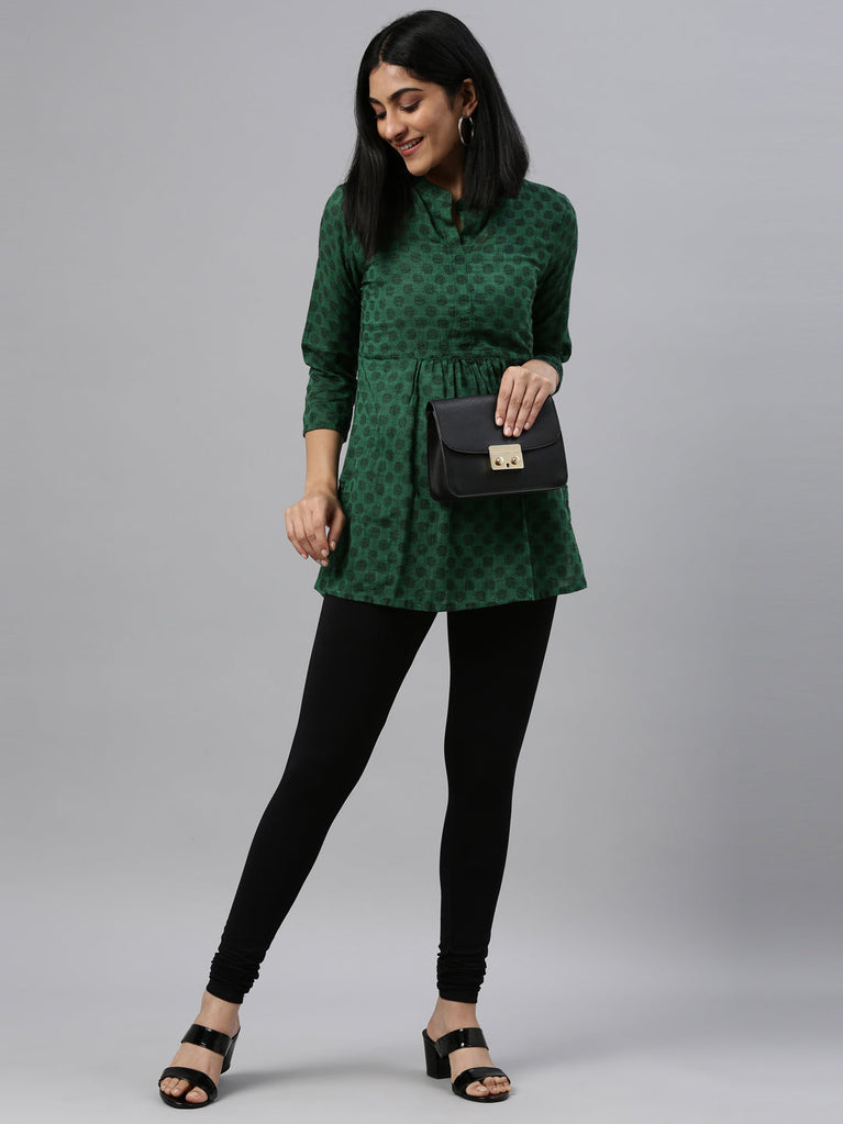 Crafted in a luxurious poly lycra blend, these ankle-length tights offer a skin fit and straight silhouette. The mid-rise design with concealed elastication ensures comfort and style, making them your go-to pick for casual outings. Pair them with a tunic or kurta for a chic look.