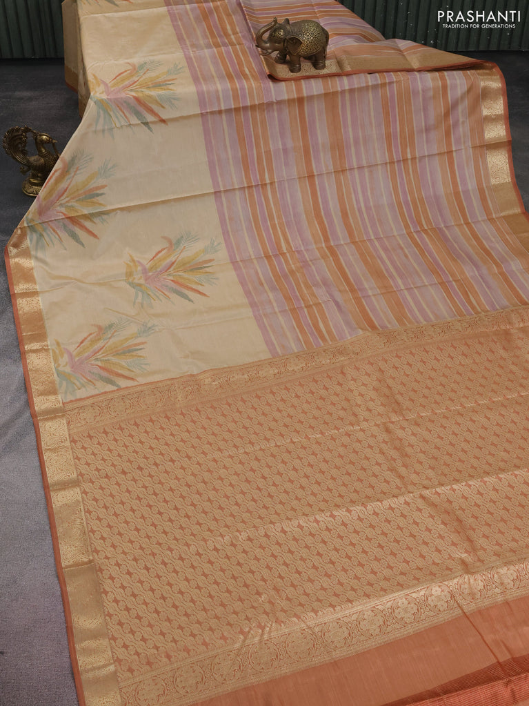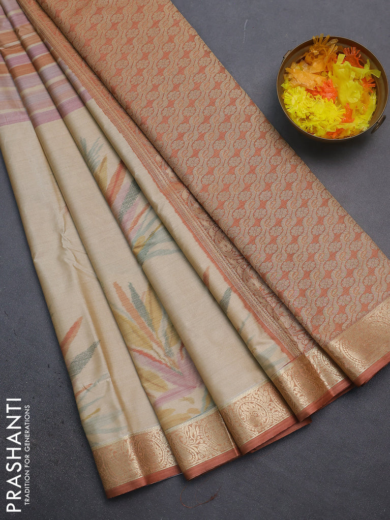 Bangalori semi silk saree beige and rust shade with allover ikat weaves and zari woven border