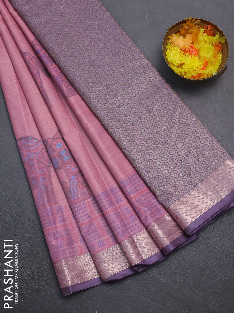 Bangalori semi silk saree pastel peach pink and violet shade with allover elephant ikat butta weaves and zari woven border