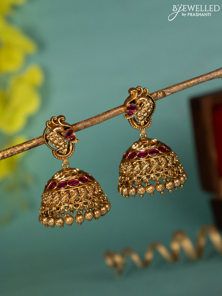 Antique jhumka with pink kemp stones and golden beads hanging
