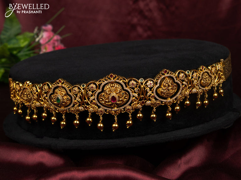 Antique self emboss hip belt lakshmi pendant with kemp & cz stones and pearl &beads hangings