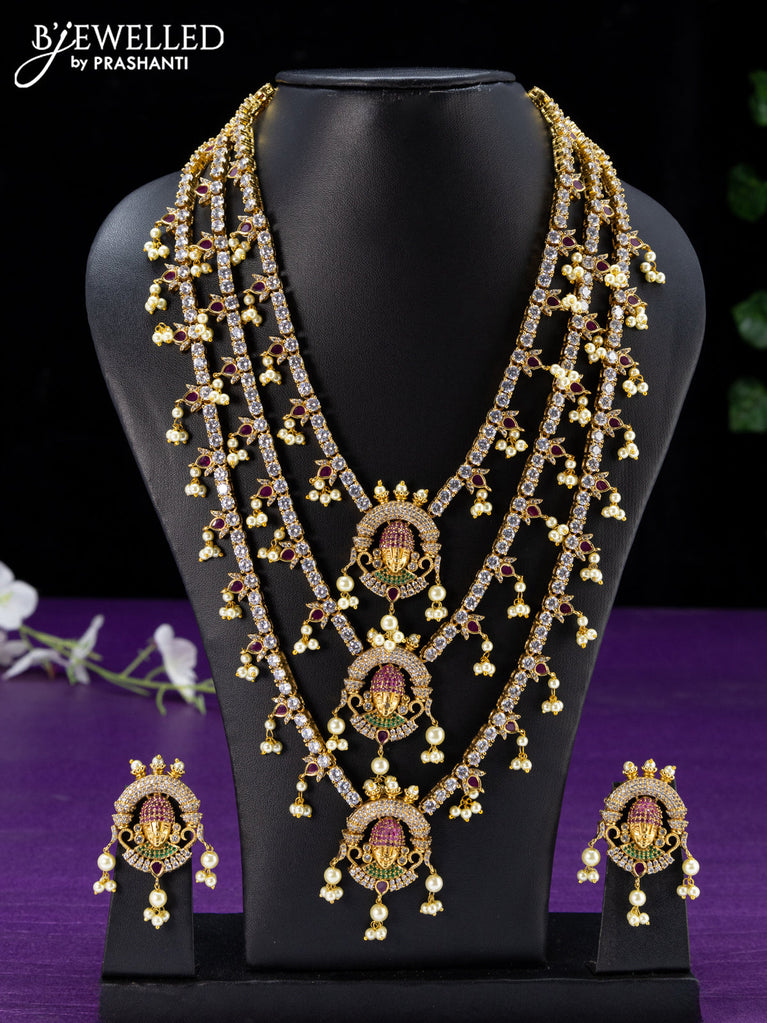 Antique triple layer haaram kemp & cz stones with tirupati balaji pendant and pearl hangings