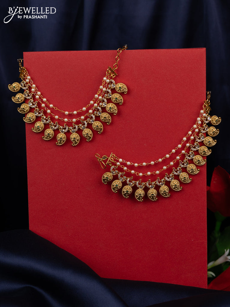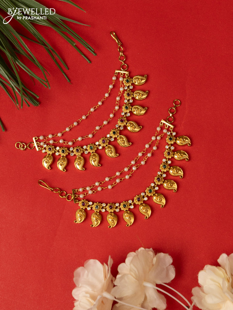 Antique triple layer mattal maanga pattern with kemp and cz stones and pearl hangings