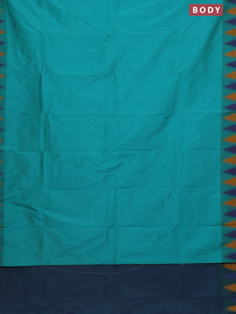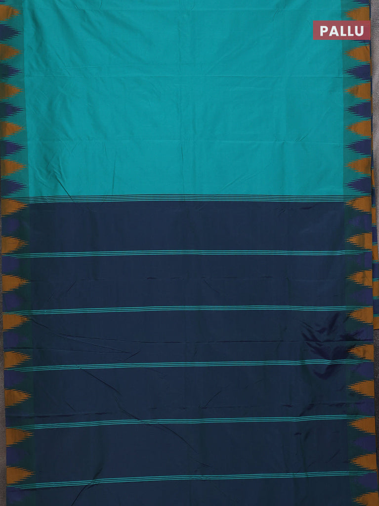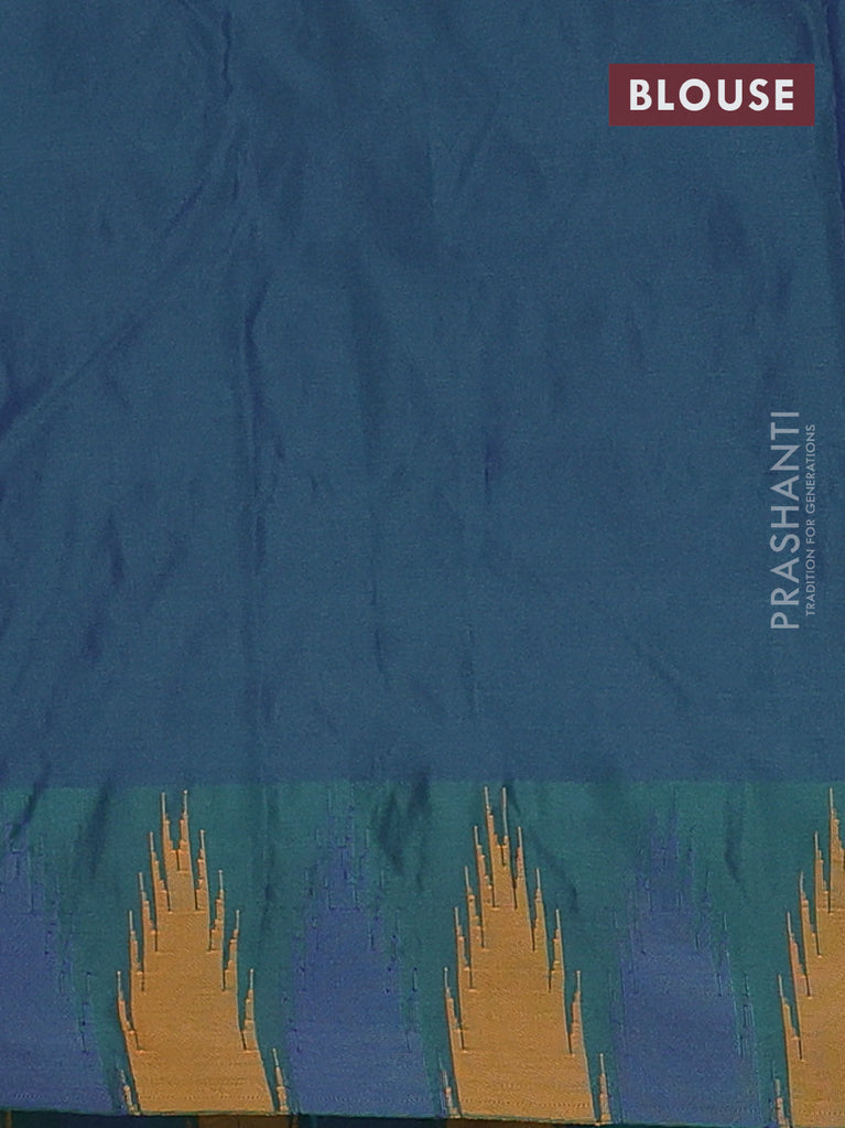 Arani semi silk saree teal green and blue mustard with plain body and temple design border