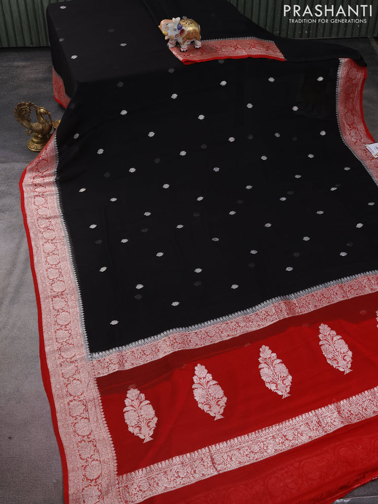 Banarasi chiffon silk saree black and red with silver zari woven buttas and silver zari woven border