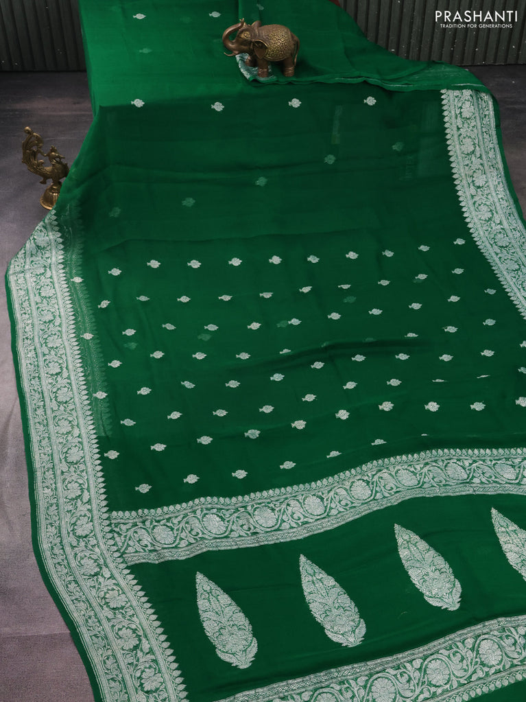Banarasi chiffon silk saree dark green with silver zari woven buttas and silver zari woven border