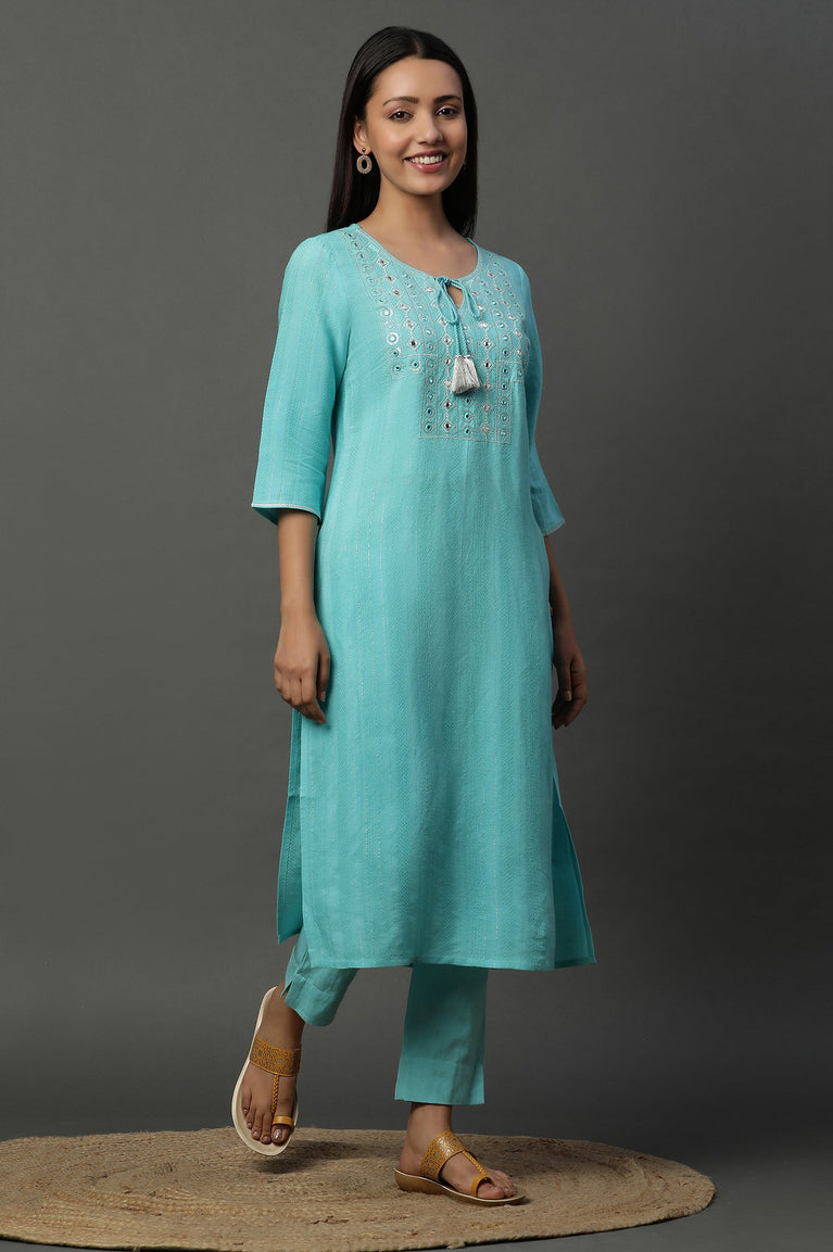 Crafted in breathable blue cotton dobby, this kurta is a winning choice for both : everyday and special occassions. It consists of an overlapped mandarin collar and a curved cuff detail on the sleeves.