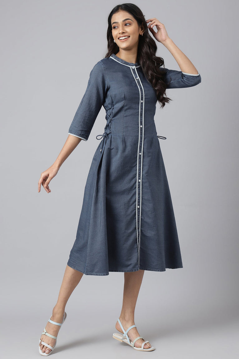 Prepare to get overwhelmed by a swirl of compliments by putting on this exquisite denim dress. It has an elegant lace detail running down the placket and the sleeves, and also features a loop-and-tie detail on both the sides of the waistline. Pull the ties as per your comfort and step out looking like an absolute diva!