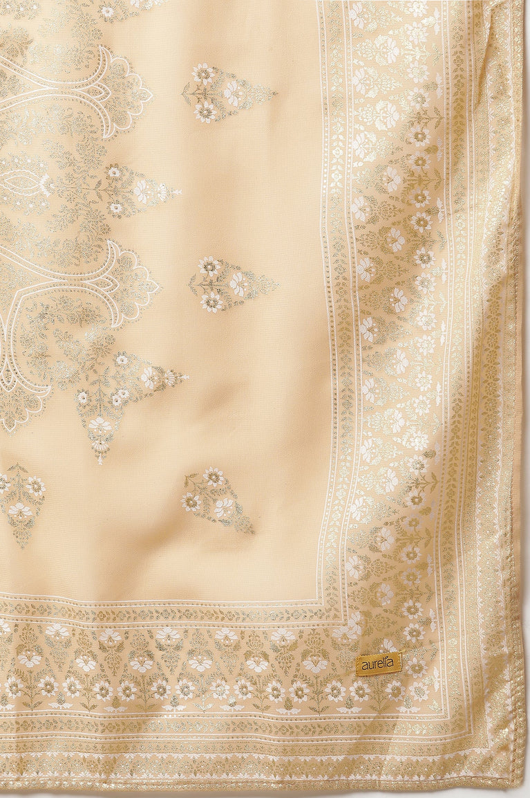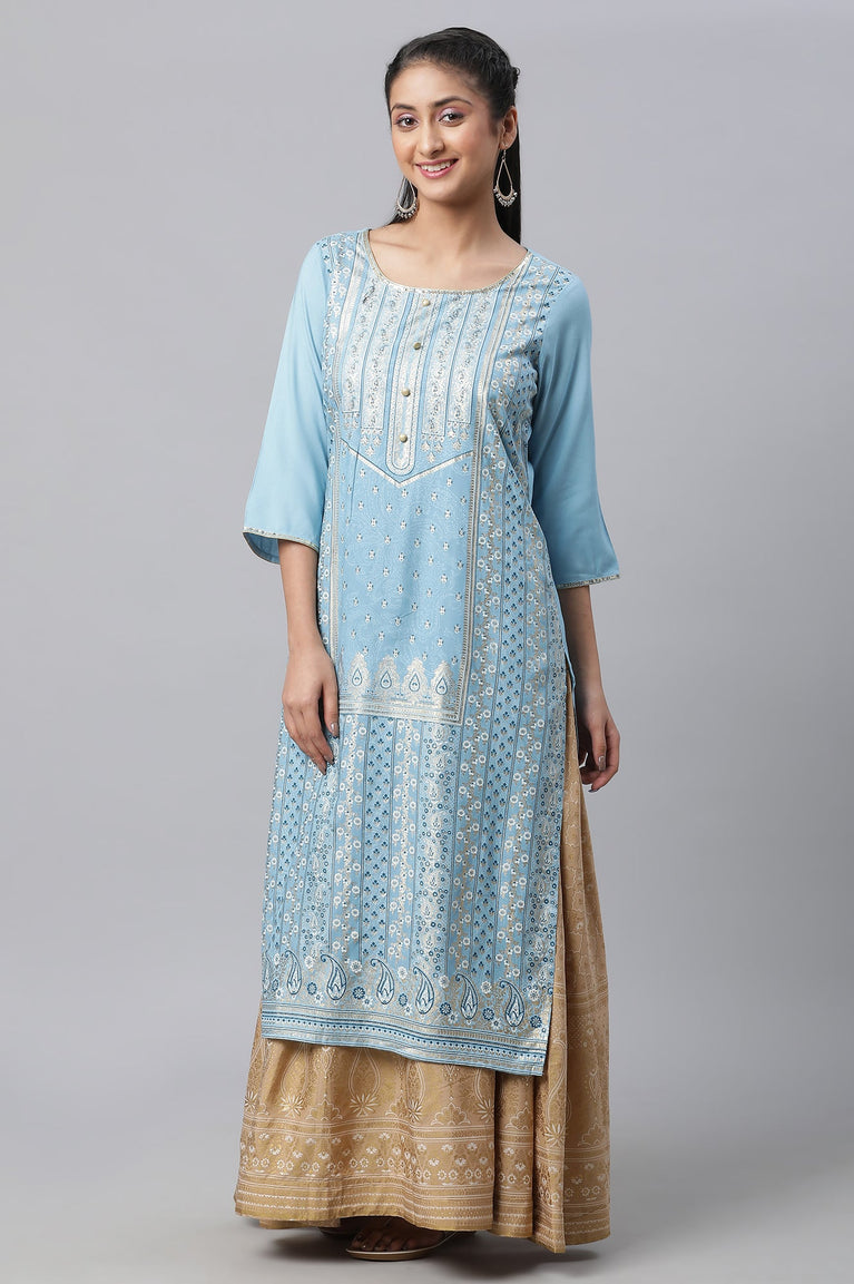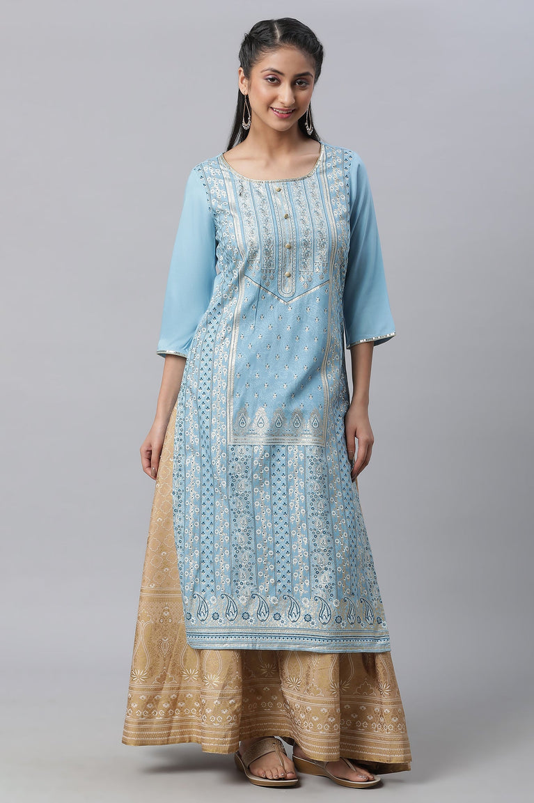 Look effortlessly stylish in this stunning ethnic pick from Aurelia kurta set collection. The set includes blue embellished straight kurta which is paired with gold printed skirt and dupatta.