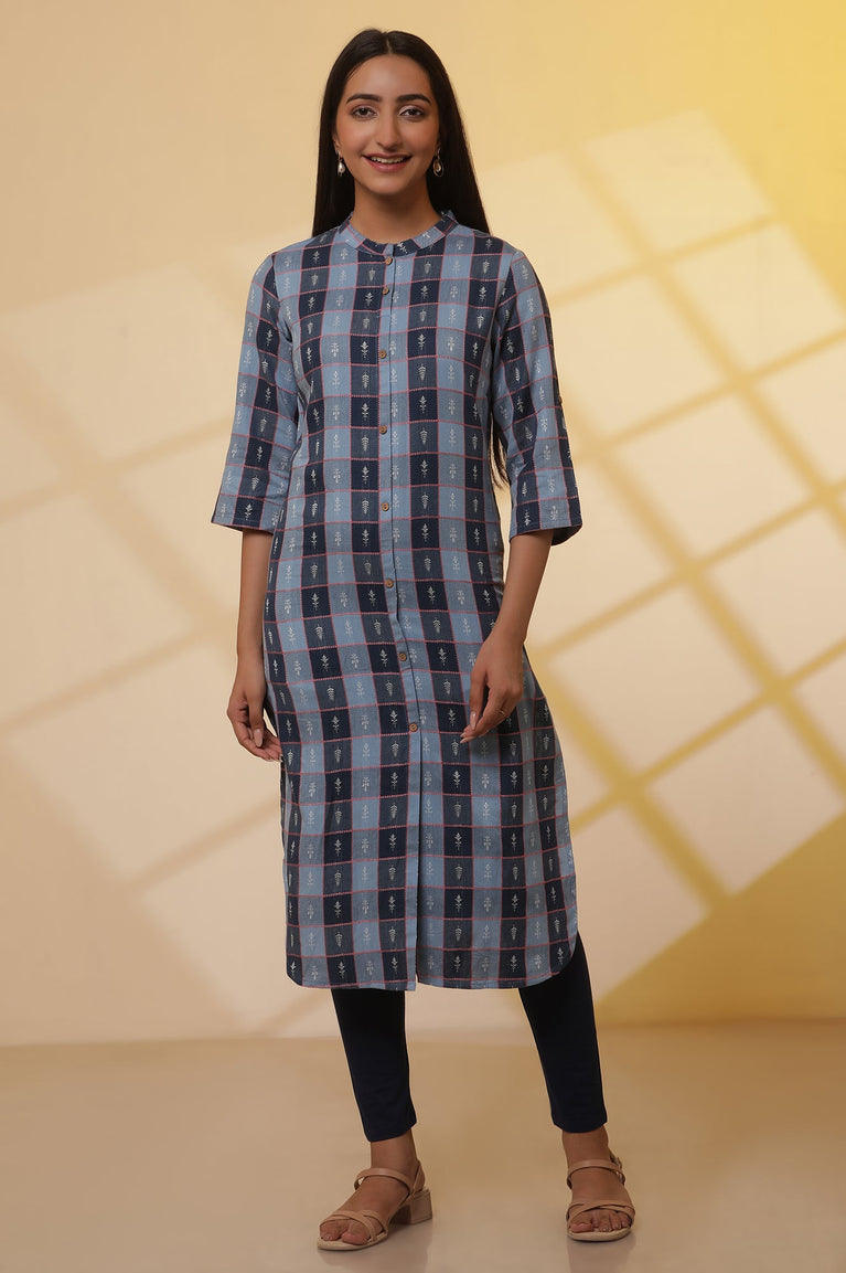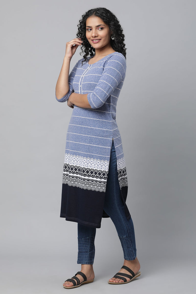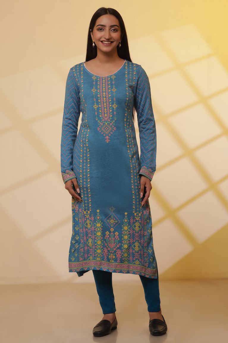 Give winter chills a warm welcome with this Ink blue winter ethnic winter kurta. This straight silhouette kurta features round neck and geometric print with border at hem.