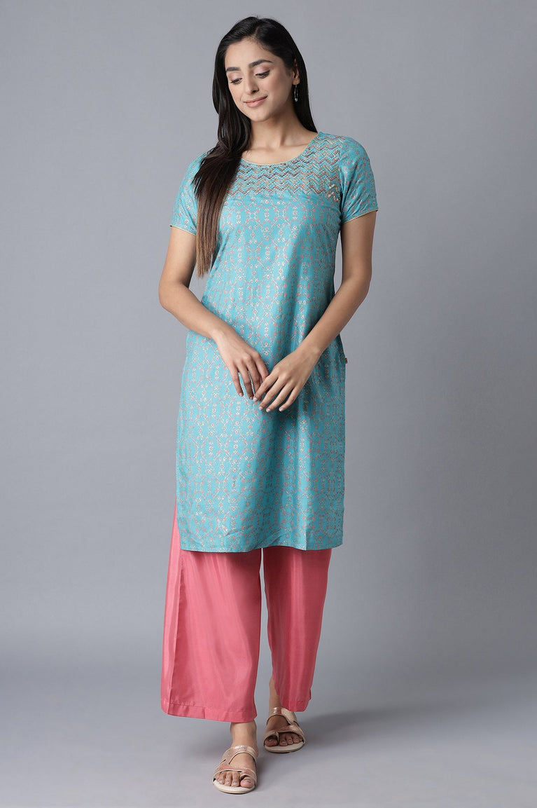 Chic Ensembles Designed To Make You Look Gorgeous On The Upcoming Festivities. It Features A Blue Glittered Geometric Print kurta Having Zari And Sequin Detailing. Comes With Coral Straight Palazzo In Mid-Rise And Elasticated Waistband.