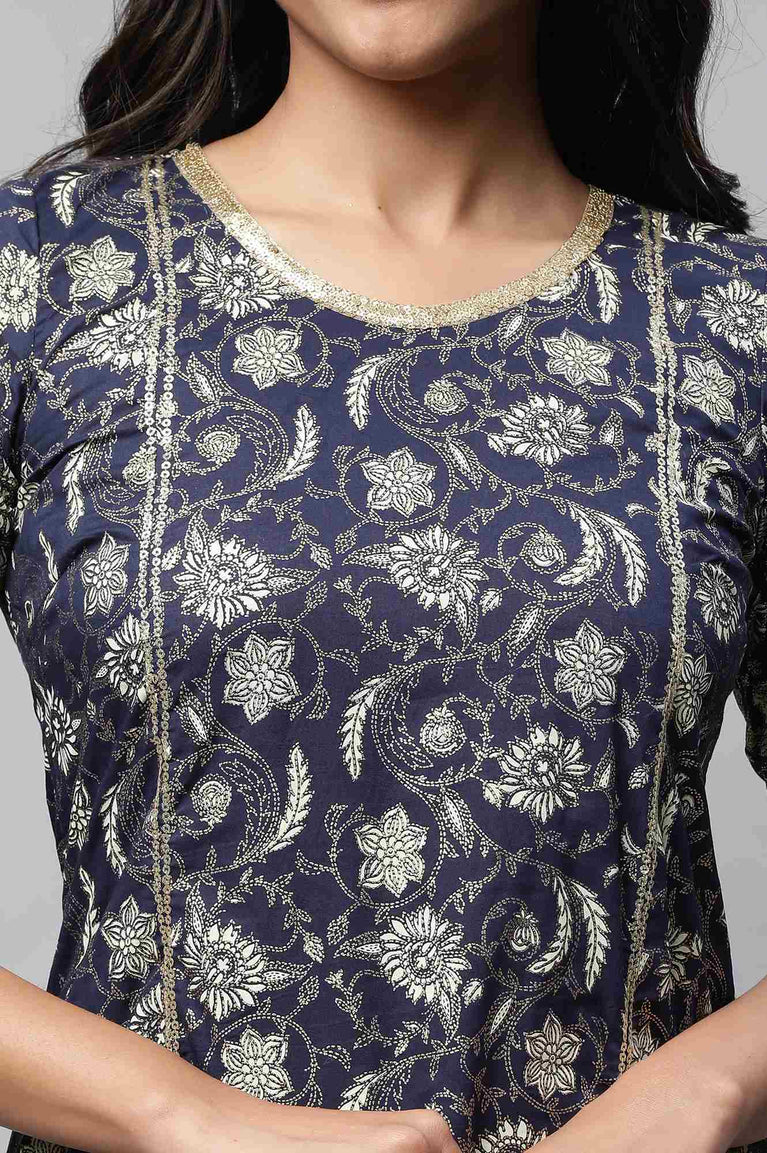 Light festive indian ethnic dress in sodalite blue colour is embellished with foil print and have border on hem and sleeves. It has mandarin collar with button closure.