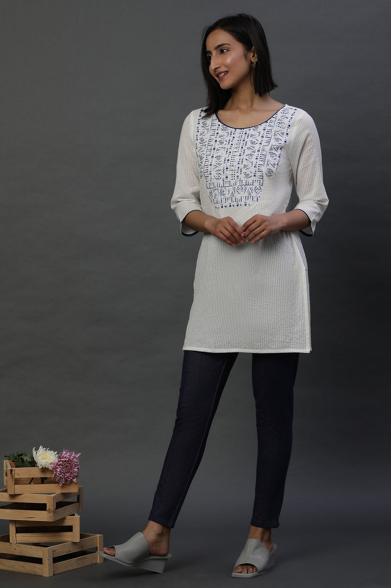 Style Your Casual Day With This Chic Aurelia Set. The Set Has Blue Jacquard kurta In Straight Silhouette And Has Round Neck. It Is Paired With Denim Jeggings.