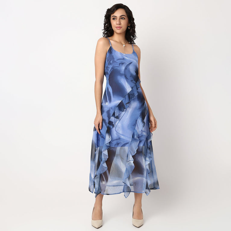 Abstract Print Flared A-Line Ruffle Detail Dress