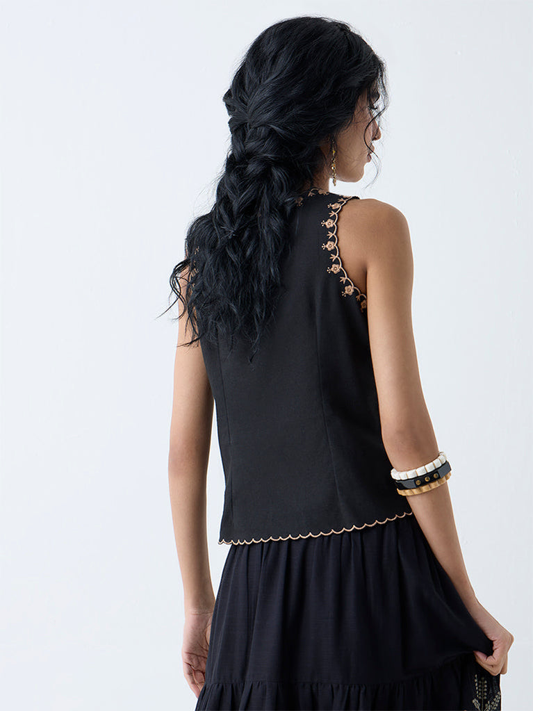 This black top from Bombay Paisley is detailed with intricate floral embroidery for a touch of elegance. Made from pure cotton, it features a V-neck and sleeveless cut, while the scalloped hem enhances its contemporary appeal.