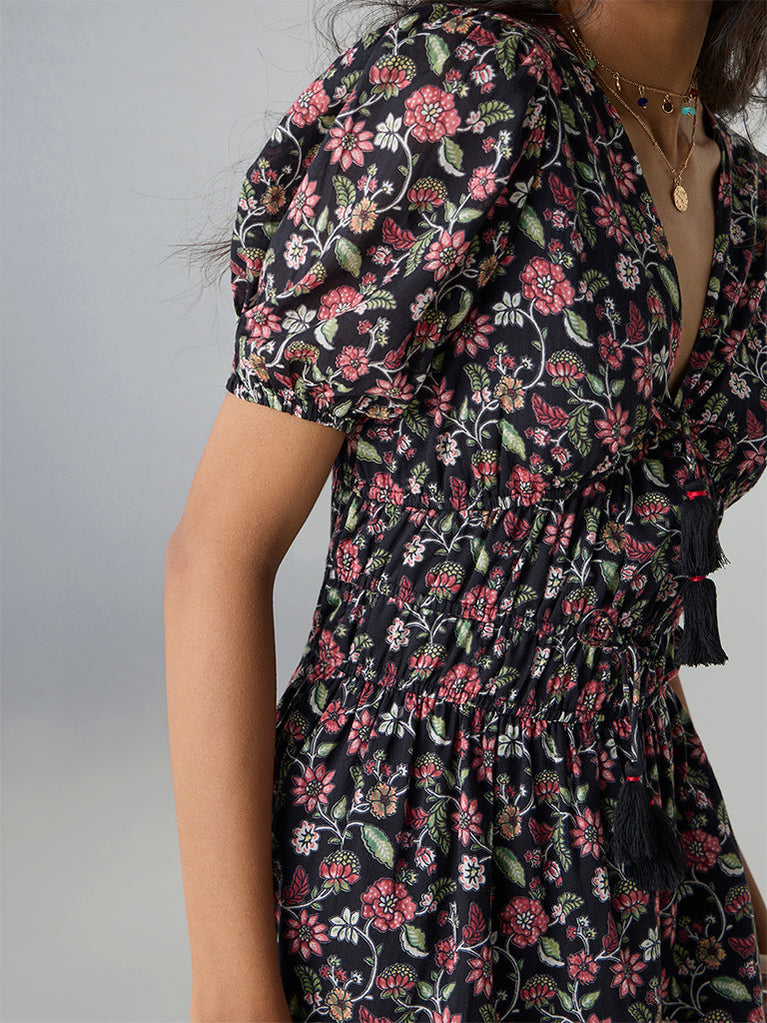 Romantic and free-spirited, this black tiered dress from Bombay Paisley is adorned with vibrant floral prints for a bohemian touch. The V-neckline features tassel-detailed knots, while the puffed sleeves and elasticated waistband with tassel accents add a playful, feminine flair. Finished with a softly flared hem, it’s perfect for effortless day-to-evening dressing.
