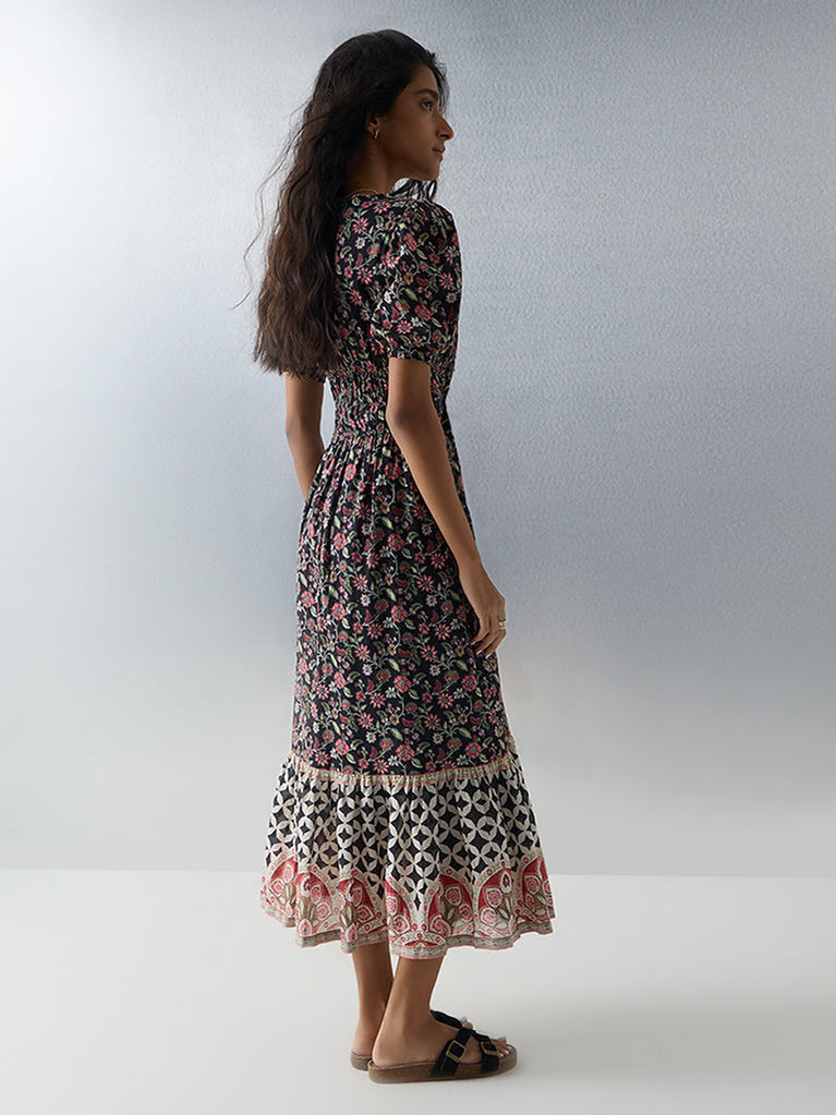Bombay Paisley Black Floral Design Cotton Tiered Dress