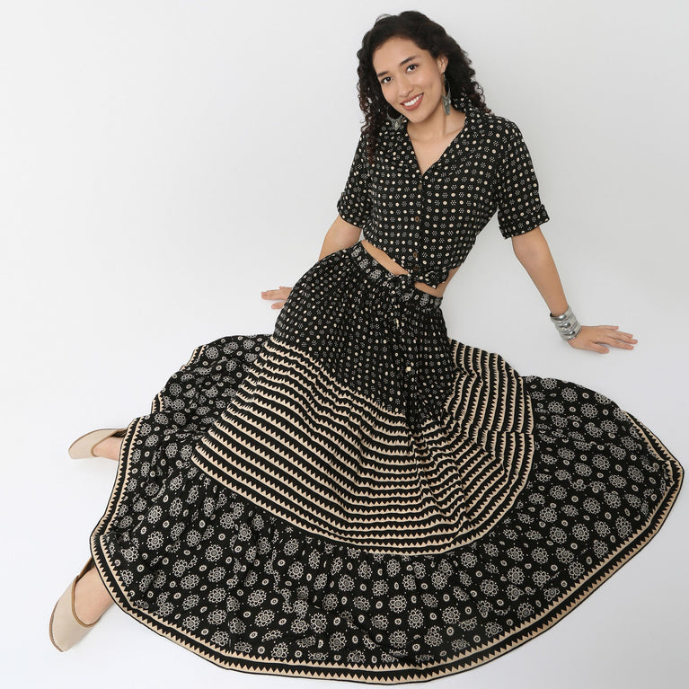 This printed pattern crop top has a off shoulder and three-fourth sleeve. Made from polyester, it is soft and comfortable to wear.