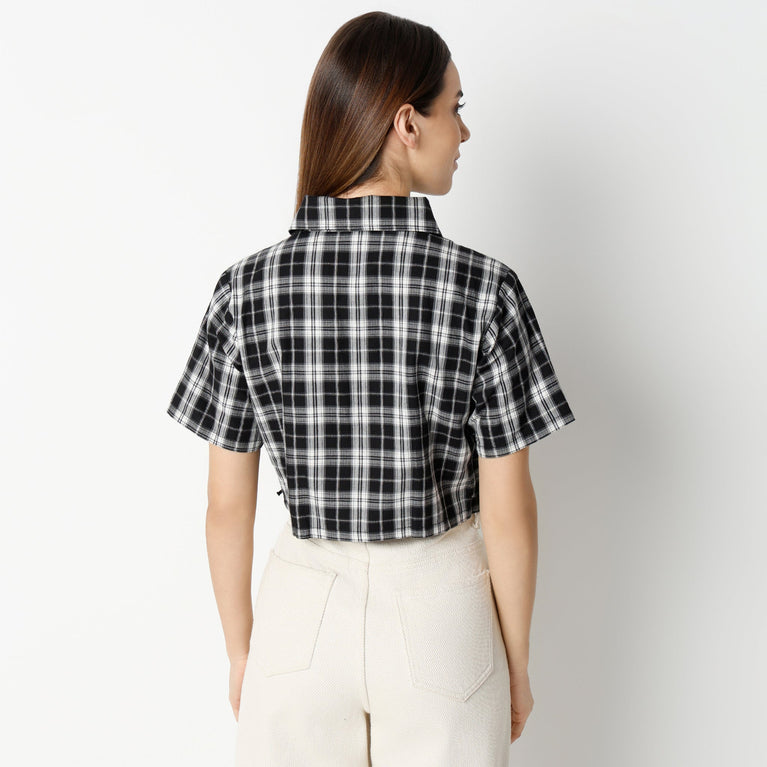 Boxy Fit Checkered Short Sleeve Crop Shirt With Front Lace Tying