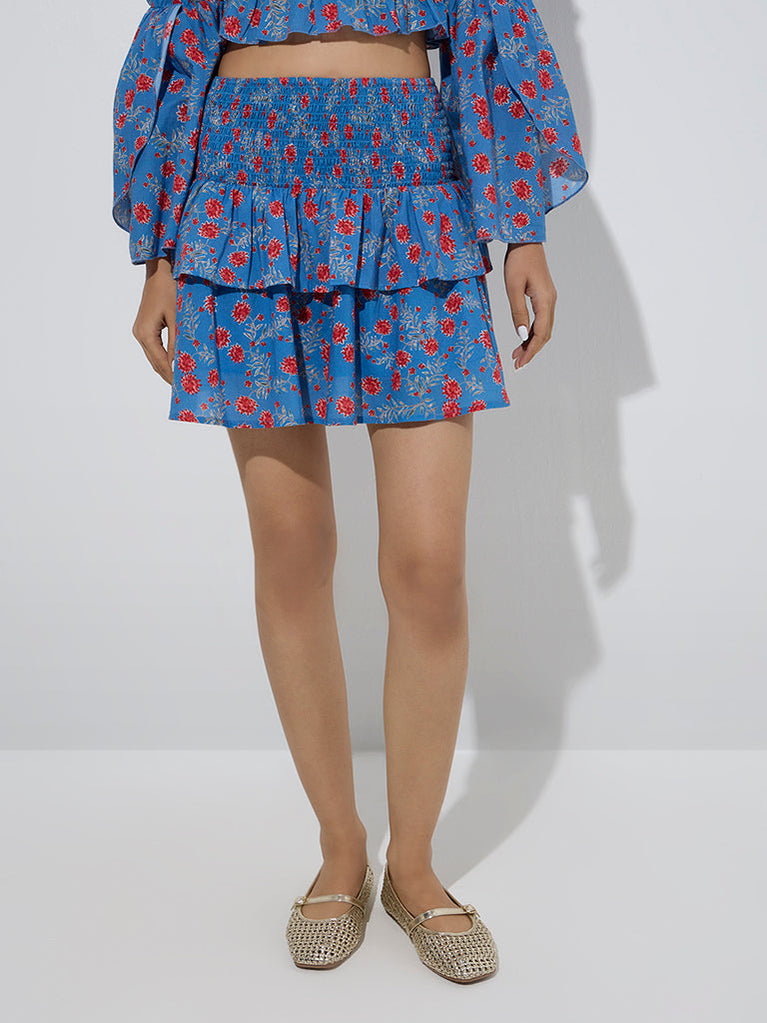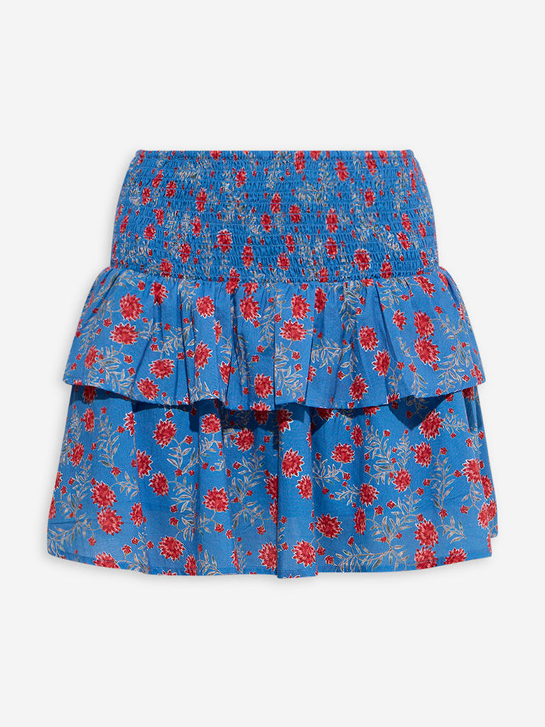 This blue skirt from Bombay Paisley spotlights vibrant floral prints for feminine appeal. Milled from a lightweight fabric, it is designed with a smocked waist and tiered ruffles that lend breezy movement and effortless charm.