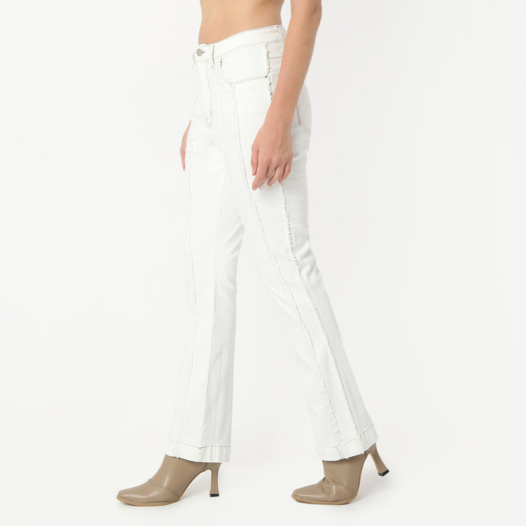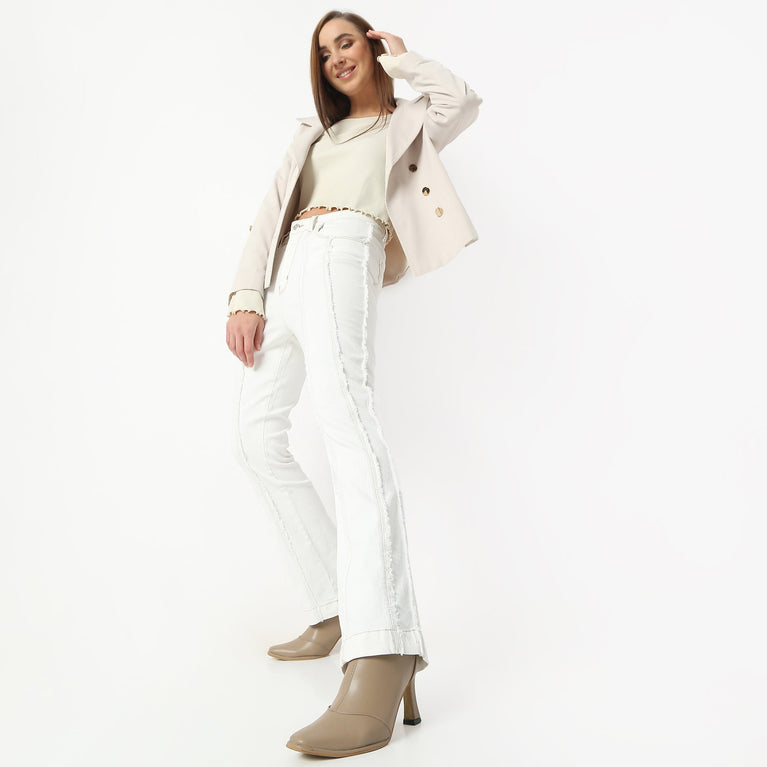 These solid pattern boot cut jeans has full length, high rise waist. Made from cotton elastane, it is soft and comfortable to wear.