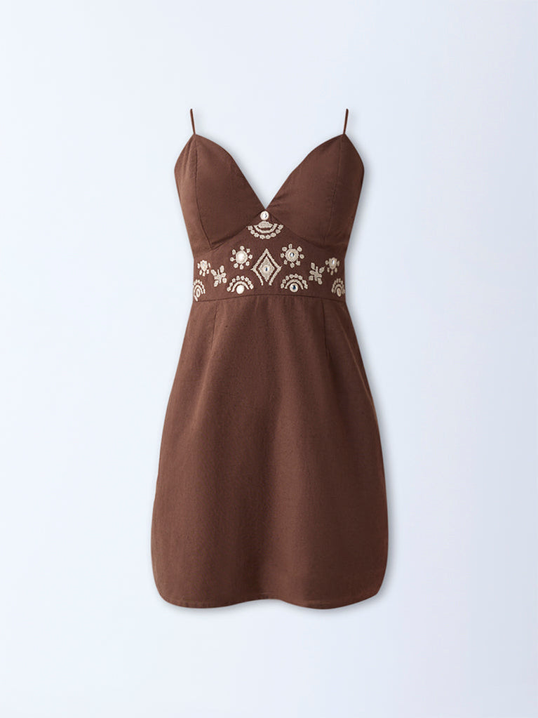 This brown dress from Bombay Paisley blends earthy elegance with artisanal detail. Constructed from a cotton-rich fabric in a breezy A-line silhouette, it features tonal embroidery that lends depth without overpowering the look. The plunge neckline is framed with interwoven cord accents and slim straps, offering a handcrafted edge to its refined design.