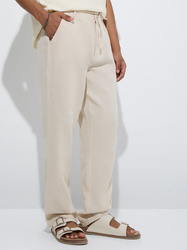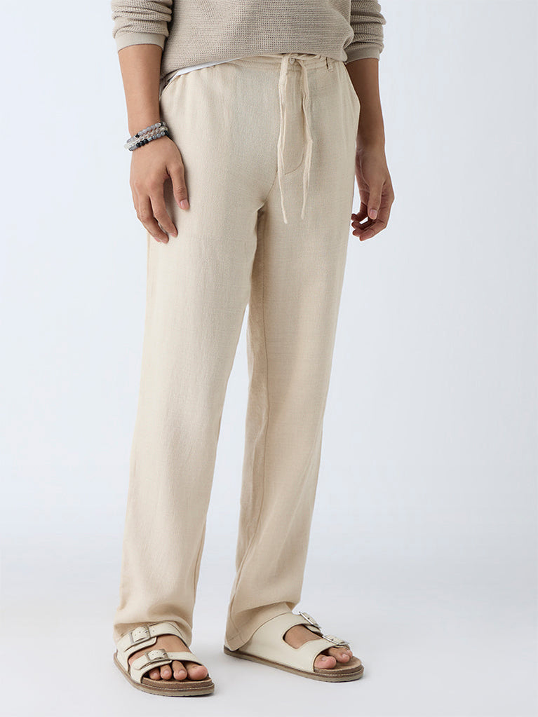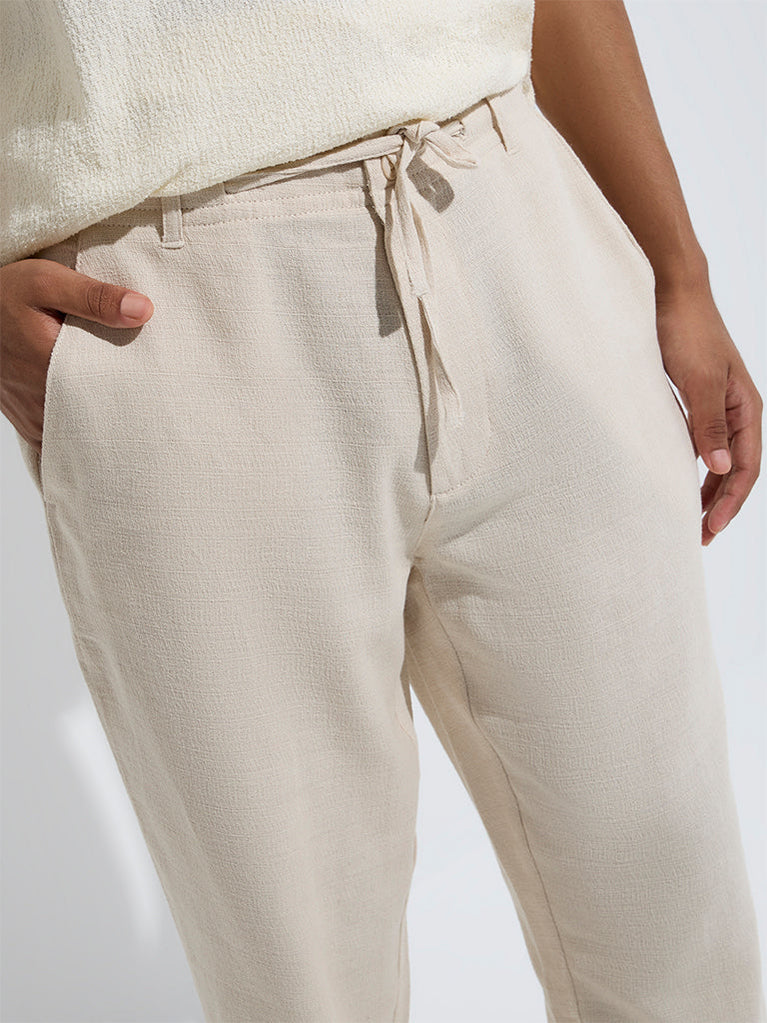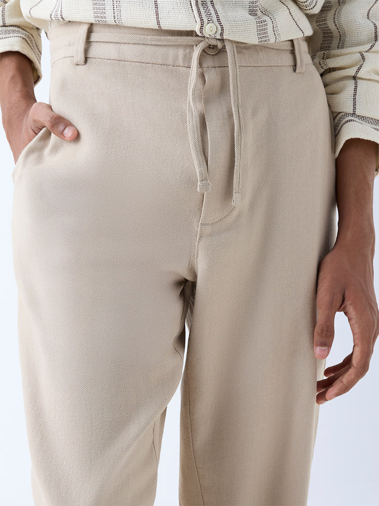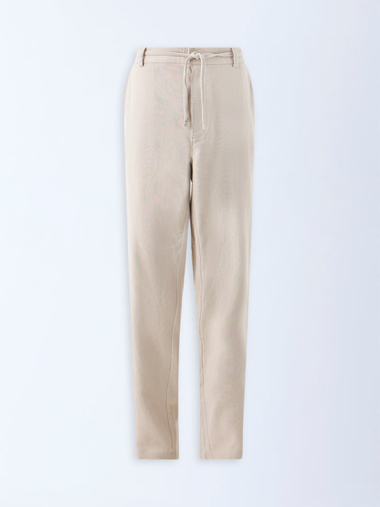 Bring sophisticated charm to your daytime assortment with these beige chinos from ETA. Cut in a relaxed fit, they feature a buttoned waistband with adjustable drawstrings, a zipper fly, and belt loops for a comfortable finish. Multiple pockets enhance functionality, while the soft cotton-blend fabric ensures all-day ease.