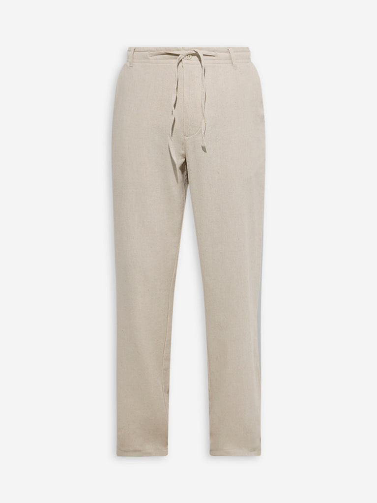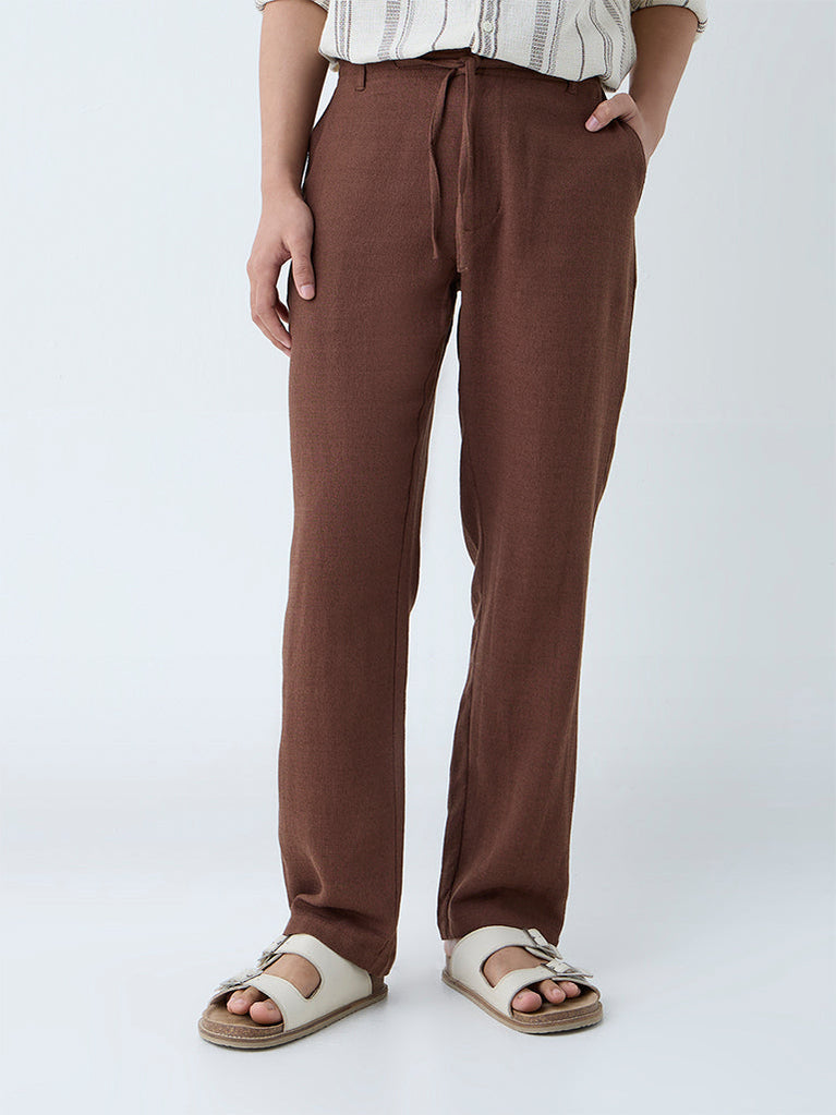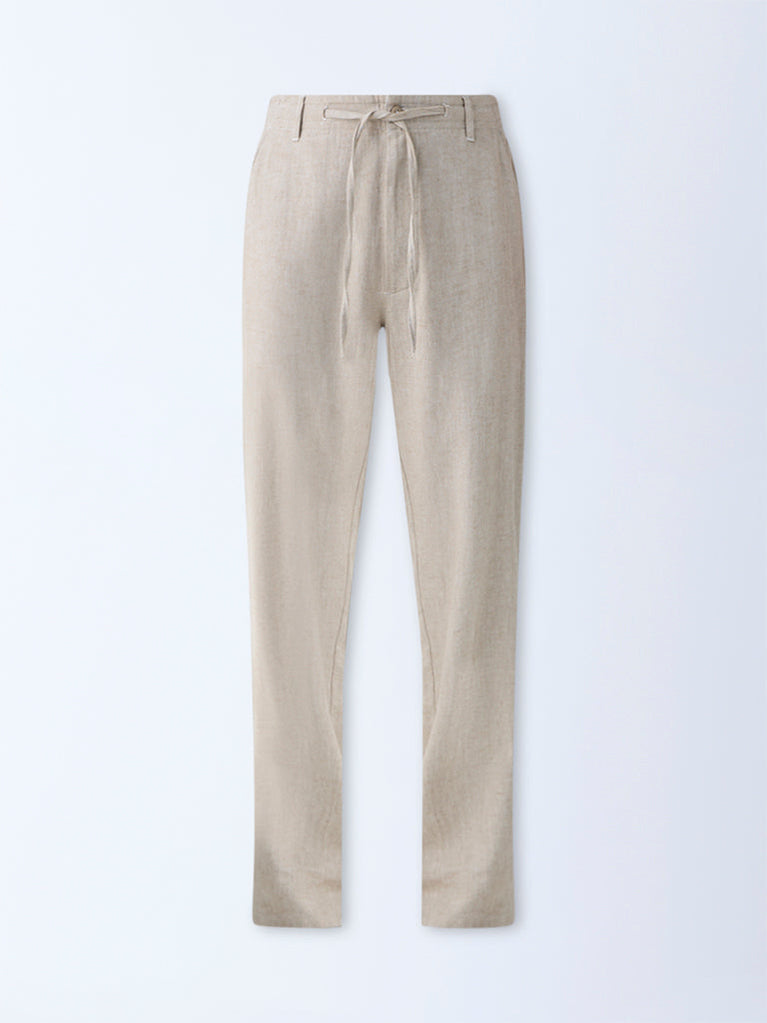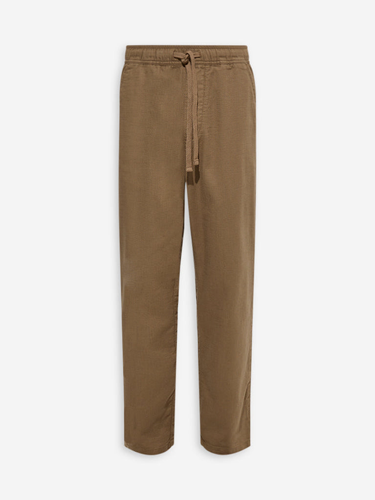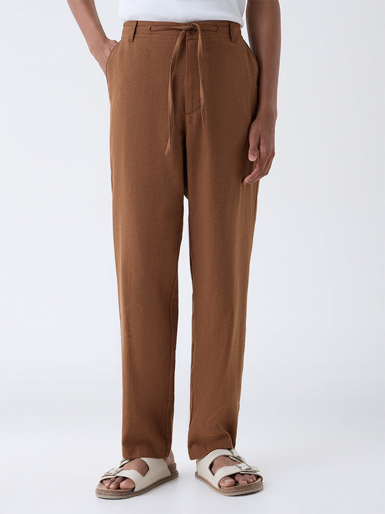 Upgrade your daytime assortment with these brown pants from ETA. Milled from a premium linen-blend fabric, they offer breathable comfort with a relaxed handle. The smooth elastic waistband with adjustable drawstrings ensures a secure fit, while multiple pockets add functional ease.