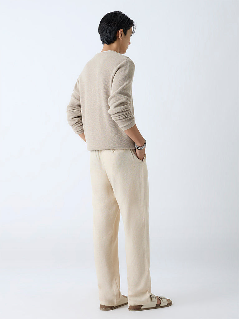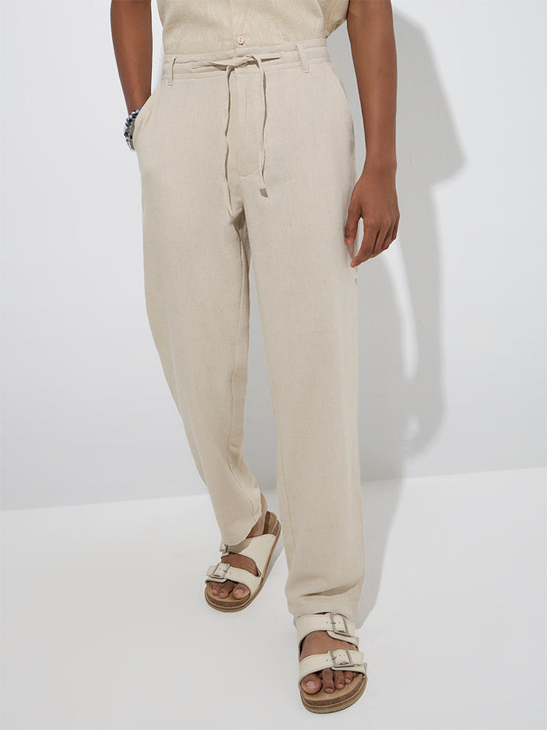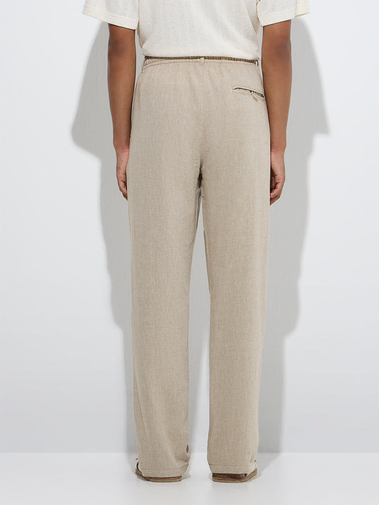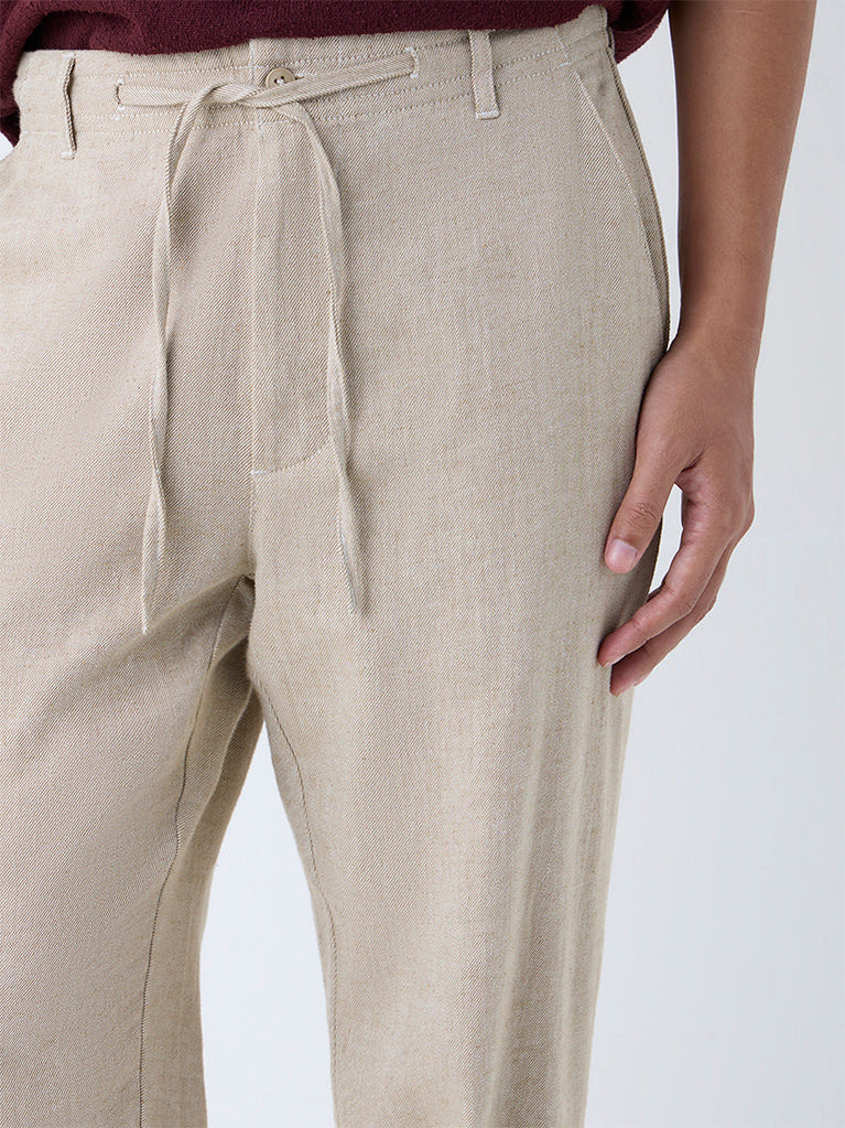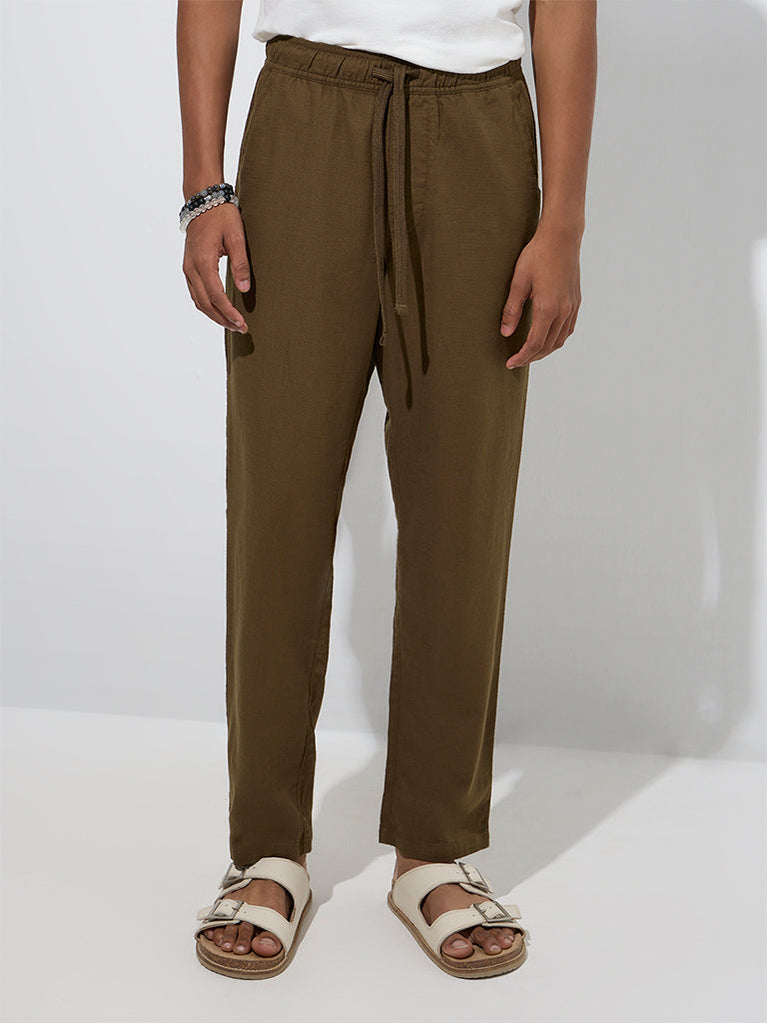 Upgrade your daytime assortment with these brown pants from ETA. Milled from a premium linen-blend fabric, they offer breathable comfort with a relaxed handle. The smooth elastic waistband with adjustable drawstrings ensures a secure fit, while multiple pockets add functional ease.