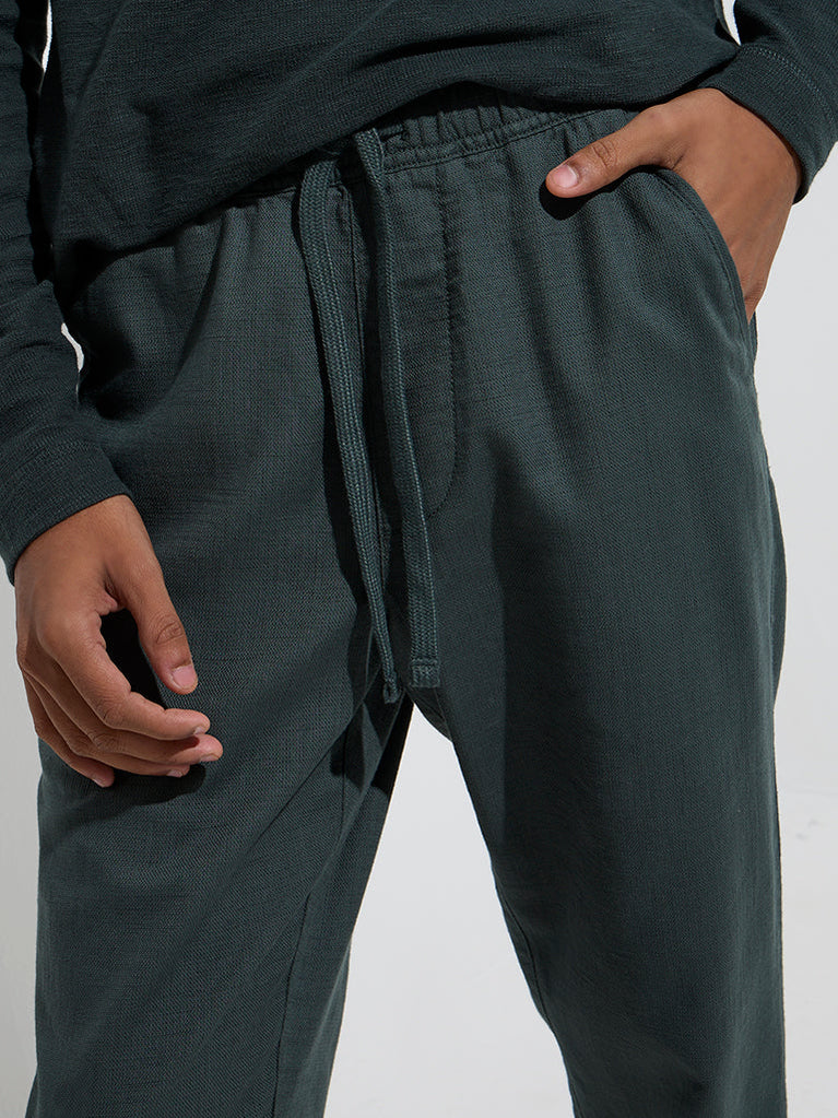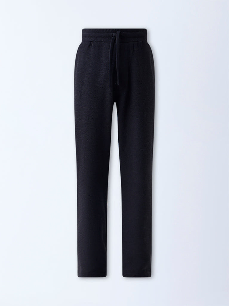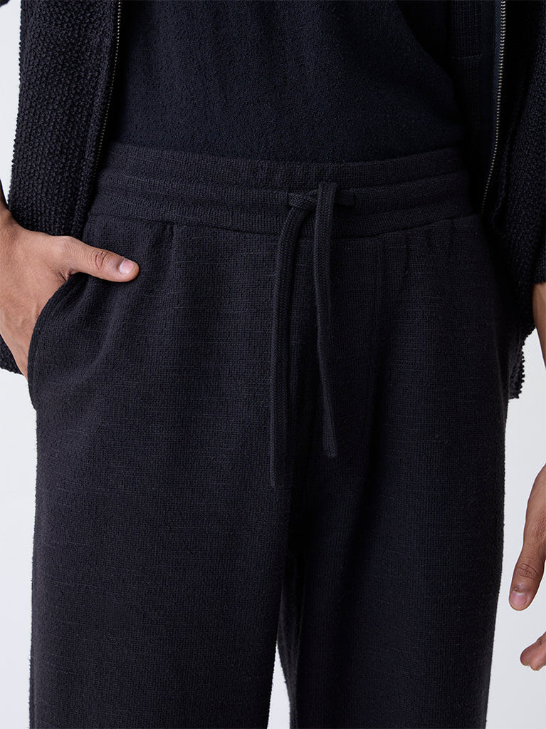 Made for slow mornings and spontaneous getaways, these black pants from ETA bring easy polish to off-duty dressing. Crafted from a soft cotton-blend fabric with a refined textured finish, they balance comfort and structure effortlessly. The relaxed fit offer laid-back ease, while the elasticated waistband, adjustable drawstrings, and side pockets keep it functional.
