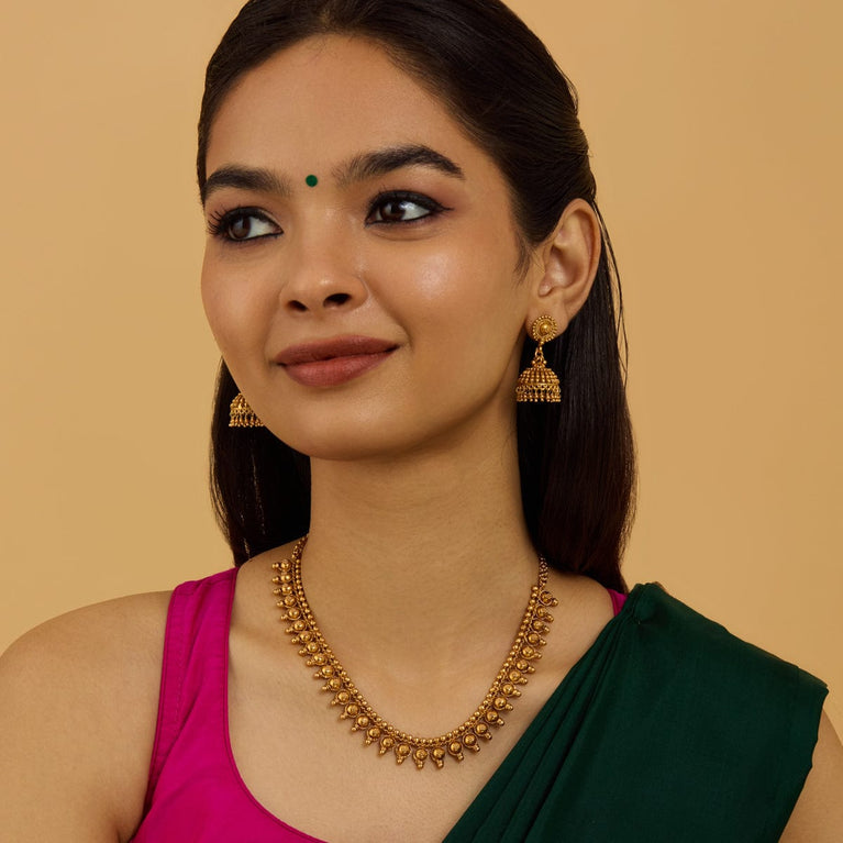 Kushal's Ruby & Green Necklace Set With Stones & Beads With a ravishing pattern on the short necklace and a pair of matching jhumka earrings, this jewellery set with an antique touch will make you the show-stopper wherever you go. Embellished with ruby and green stones set in a linear pattern and hanging beads, it is plated in gold. This necklace set has a distinctive charm and is perfect for wedding seasons.