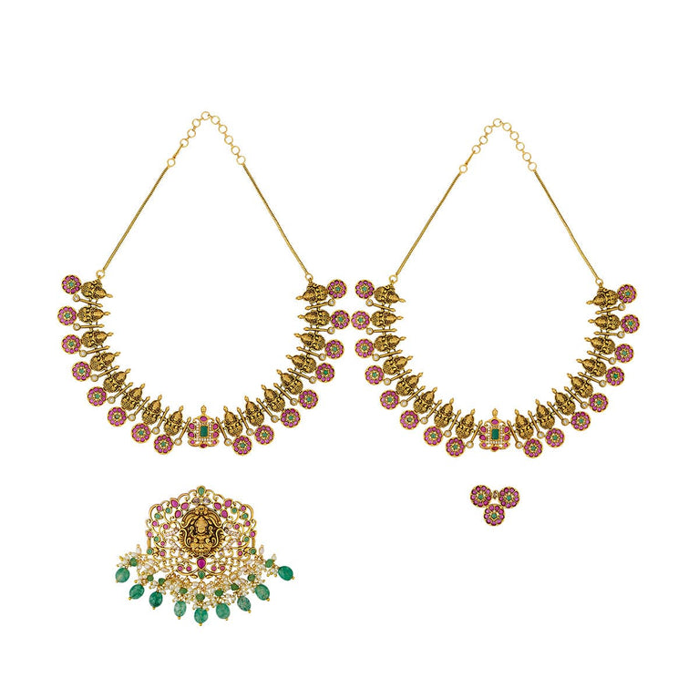Kushal's Fashion Jewellery Flower Motif Antique TikkaIdeal for those who appreciate the charm and elegance of a decent look! Crafted with precision, our antique tikka boasts a queenly allure that never fails to wow. It's encrusted with brilliantly gleaming synthetic ruby and green-coloured stones, which adds an irresistible sparkle to your regal charm. Known for its decent appearance, it blends the traditional aesthetic with a contemporary sensibility.