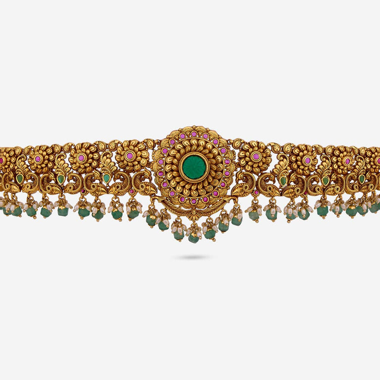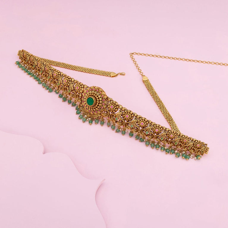 Kushal's Fashion Jewellery Flower Motif Antique BeltIf you are looking for a belt to match the elegance of your ethnic outfits, take a look at our latest antique belt with gold polish on the green and ruby stones. The eye-catching work details on this belt allow it to blend with all outfits and occasions. Grab yours now.