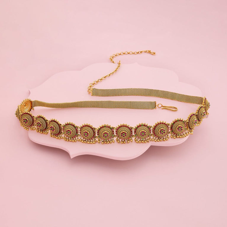 Kushal's Fashion Jewellery Flower Design BeltIf you are tired of wearing the common fashion accessories and want something different to touch up your look, you need our latest antique belt studded with ruby stones. This belt will go perfectly with all ethnic outfits and traditional accessories to effortlessly make you the trendsetter this wedding season.