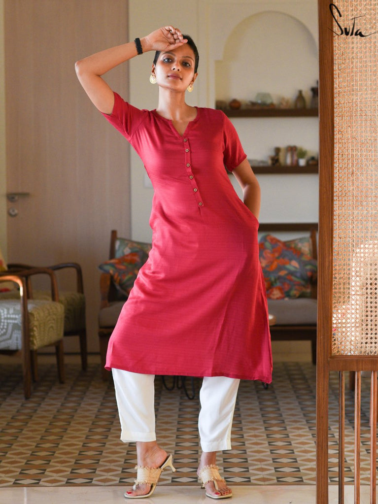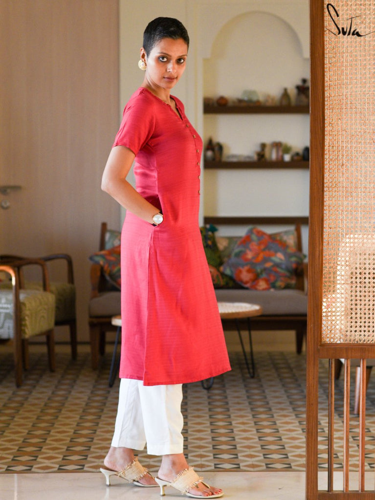 Question your perceptions when you’re wearing this gorgeous red and pink cotton dress.