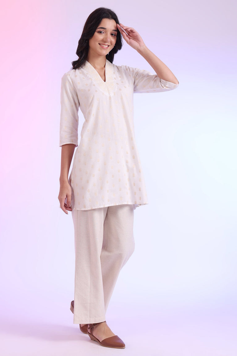 Beige Yarn Dyed Straight Cotton Blend Kurti