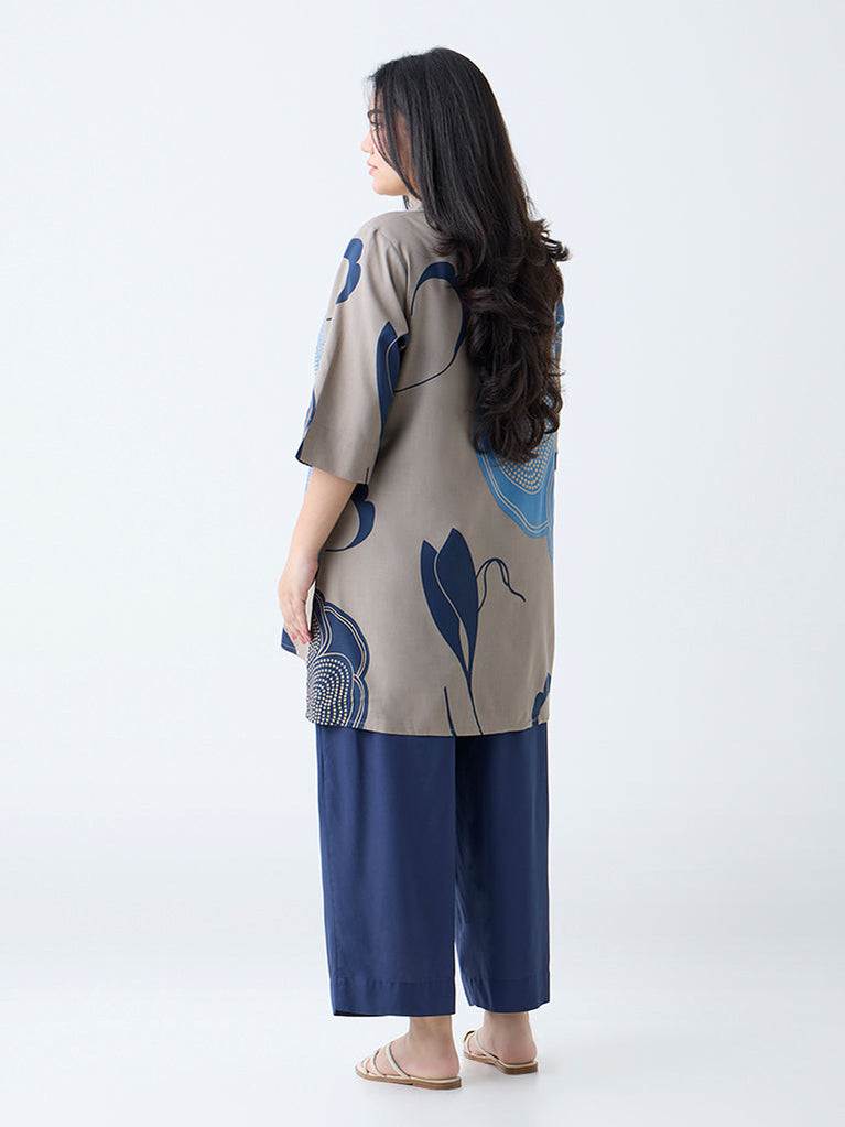 Diza taupe tunic brings a warm, earthy palette to life with foliage prints, creating a balanced blend of comfort and charm. Designed with a notched neckline, a neat quarter button placket, and three-quarter sleeves, this lightweight piece offers relaxed sophistication for day-to-day ethnic styling.