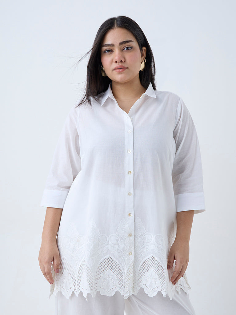 This white kurta from Diza showcases intricate schiffli embroidery across a graceful A-line silhouette. Spun from pure cotton, it features a crisp collar, a neat button placket, and three-quarter sleeves for a refined finish. Practicality meets style with a discreet slip pocket, making it an elegant yet functional addition to your wardrobe.