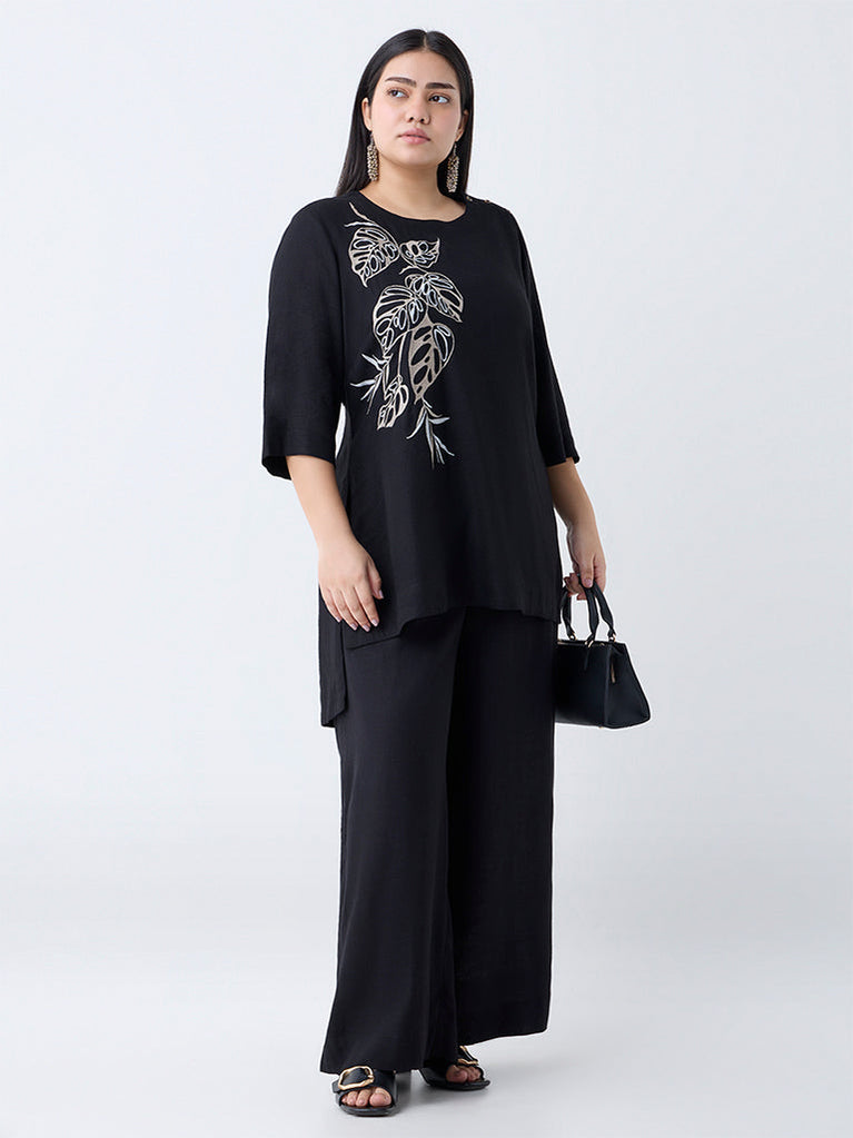 Bring effortless elegance to your wardrobe with this black high-low kurti from Diza. Adorned with delicate botanical embroidery, it features a classic round neckline with button detailing and three-quarter sleeves. Crafted from a soft linen blend, it offers a perfect balance of style, comfort, and sophistication.