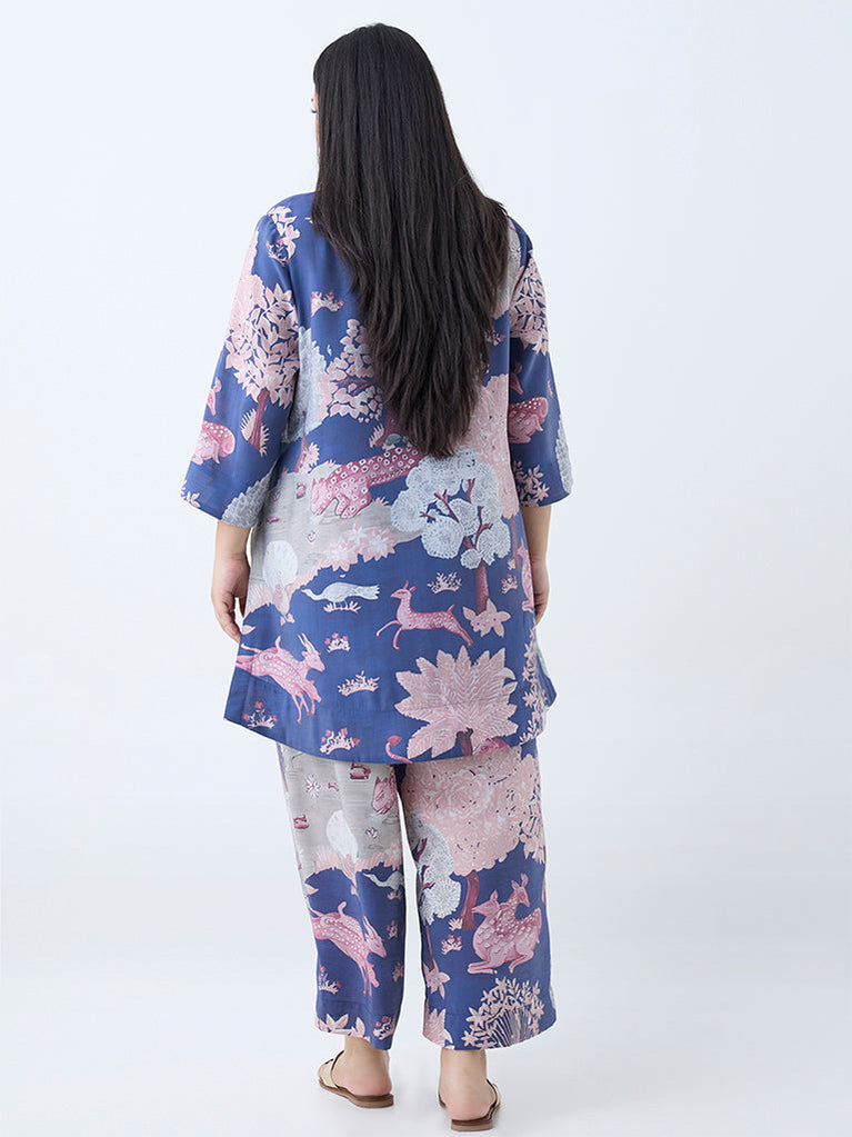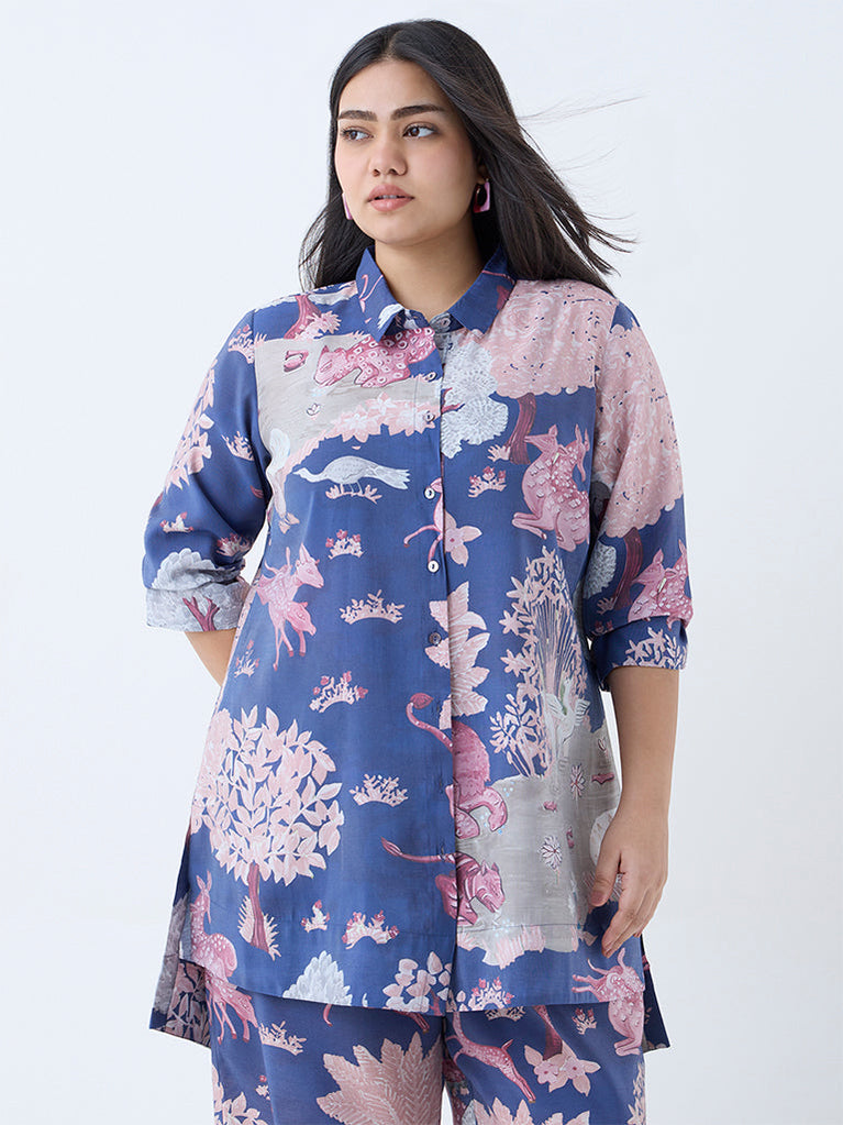 Diza Blue Forest-Themed High-Low Tunic