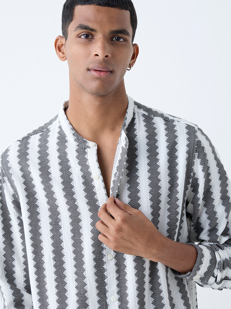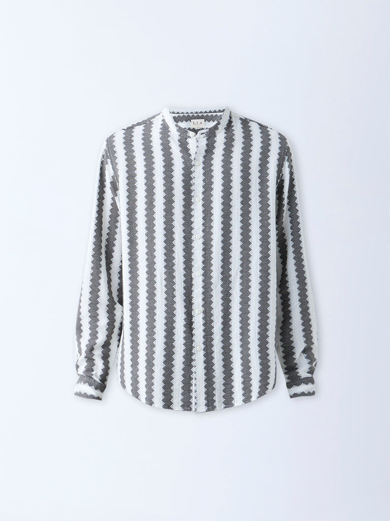 Stay cool and effortlessly stylish with this off-white striped shirt from ETA. Crafted from breathable cotton with a textured weave, it ensures a crisp feel throughout the day. Designed with a classic mandarin collar and full sleeves, this shirt offers a relaxed yet smart silhouette, making it the perfect choice for off-duty looks.