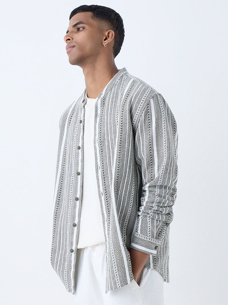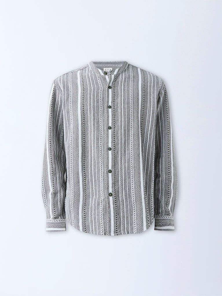Keep it simple and stylish with this olive striped shirt from ETA. Made from breathable cotton in a relaxed frame, it features a band collar, button-down front, and full sleeves.