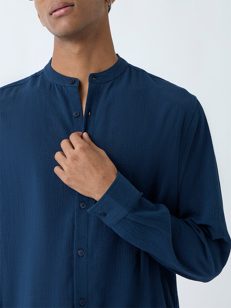 This navy shirt from ETA is detailed with embroidered stripes that add depth without overwhelming the look. Created from a breathable fabric, it features a relaxed silhouette with full sleeves, a mandarin collar, and a button placket. A clean, modern option that works just as well for casual days as it does for low-key evenings.