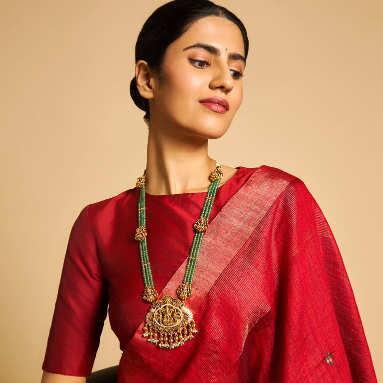 Kushal's Ruby & Green Festive Long Necklace With Stones & Beads This gold-plated long necklace with jhumka earrings looks absolutely stunning. The jewellery set has an antique feel and will look great with ethnic outfits. The jhumkas have white pearl hangings that make it look very elegant. The traditional appearance of the jewellery set makes it perfect to be worn with saree and ghagra choli.