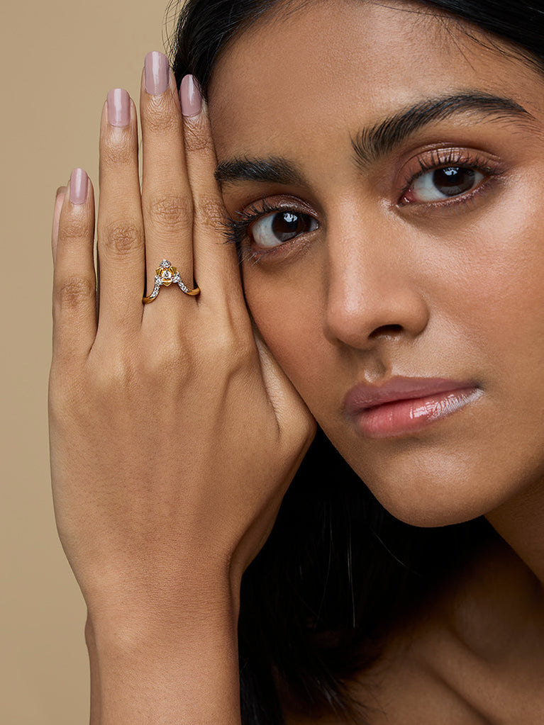 This gold floral solitaire ring from Westside X Pome features a delicate floral motif with a polished gold-tone band. A clear central stone sits at the heart of the design, complemented by small leaf-shaped accents along the band, each adorned with clear stones. With its slender profile and subtle detailing, this piece brings a refined touch to both everyday wear and special occasions.