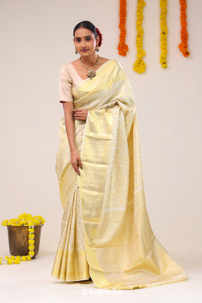 Delicate and precious, this Hansa Yellow Tissue Kanjivaram Saree features multi-geometerical pattern jaal weaving in gold zari. The contrasting gold big border with floral and diamond pattern elevates the look. Drape it for festive and wedding occasions.