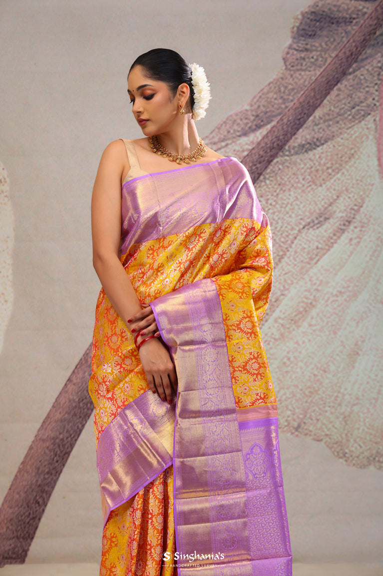 A luminous golden yellow kanjivaram silk saree showcasing heritage floral jaal motifs in fine gold zari all over the body. The big purple border features traditional arrangement of floral, birds and butti motifs. A perfect choice for wedding receptions and festive occasions.