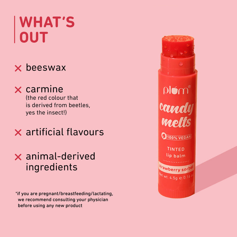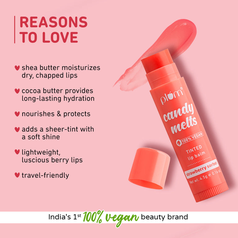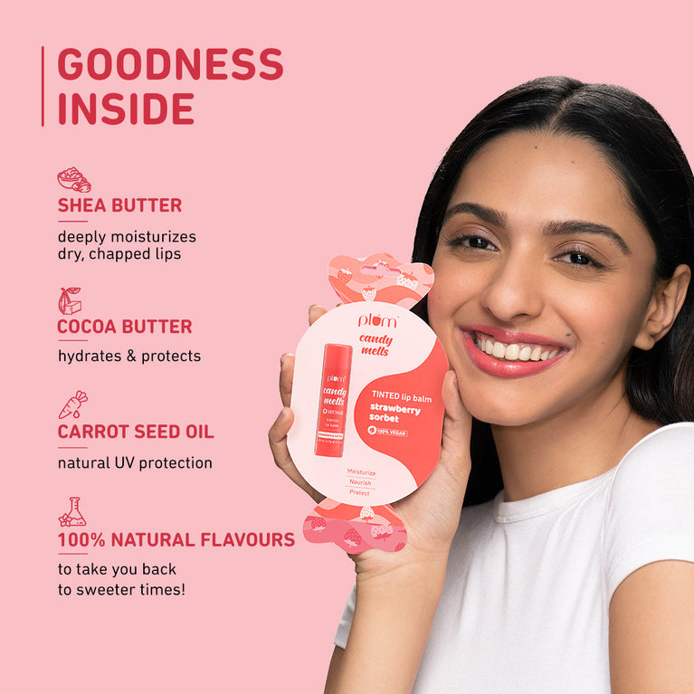 Candy Melts Strawberry Sorbet Lip Balm benefits: * hydrates dry & chapped lips * long lasting moisturization * adds a sheer-tint with a soft shine * nourishes & protects